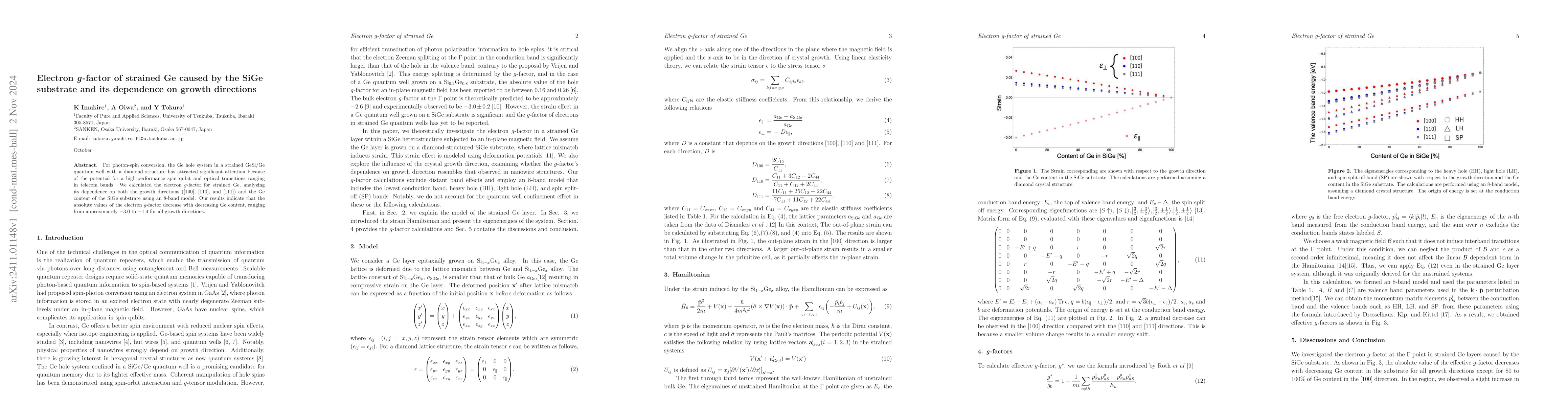 This study investigates the electron g-factor of strained germanium (Ge) in a SiGe substrate, focusing on its dependency on growth directions [100], [110], and [111]. The findings reveal that the g-factor values decrease with lower Ge content in the SiGe substrate, ranging from -3.0 to -1.4, highlighting potential for high-performance spin qubits in photon-spin conversion applications.