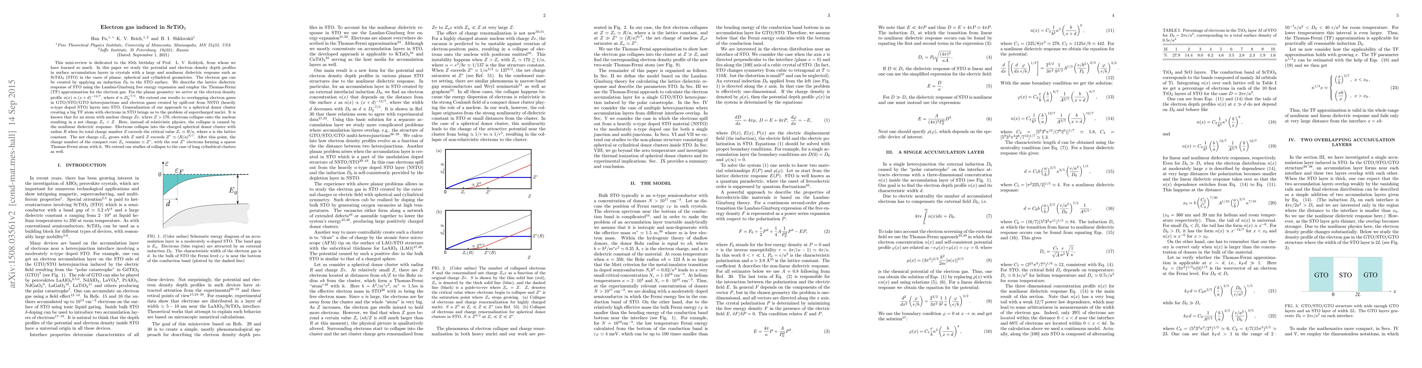 This mini-review is dedicated to the 85th birthday of Prof. L. V. Keldysh, from whom we have learned so much. In this paper we study the potential and electron density depth profiles in surface accumulation layers in crystals with a large and nonlinear dielectric response such as SrTiO$_3$ (STO) in the cases of planar, spherical and cylindrical geometries. The electron gas can be created by applying an induction $D_0$ to the STO surface. We describe the lattice dielectric response of STO using the Landau-Ginzburg free energy expansion and employ the Thomas-Fermi (TF) approximation for the electron gas. For the planar geometry we arrive at the electron density profile $n(x) \propto (x+d)^{-12/7}$, where $d \propto D_0^{-7/5} $. We extend our results to overlapping electron gases in GTO/STO/GTO multi-heterojunctions and electron gases created by spill-out from NSTO (heavily $n$-type doped STO) layers into STO. Generalization of our approach to a spherical donor cluster creating a big TF atom with electrons in STO brings us to the problem of supercharged nuclei. It is known that for an atom with nuclear charge $Ze$, where $Z > 170$, electrons collapse onto the nucleus resulting in a net charge $Z_n < Z$. Here, instead of relativistic physics, the collapse is caused by the nonlinear dielectric response. Electrons collapse into the charged spherical donor cluster with radius $R$ when its total charge number $Z$ exceeds the critical value $Z_c \simeq R/a$, where $a$ is the lattice constant. The net charge $eZ_n$ grows with $Z$ until $Z$ exceeds $Z^* \simeq (R/a)^{9/7}$. After this point, the charge number of the compact core $Z_n$ remains $\simeq Z^*$, with the rest $Z^*$ electrons forming a sparse Thomas-Fermi electron atmosphere around it. We extend our results to the case of long cylindrical clusters as well.