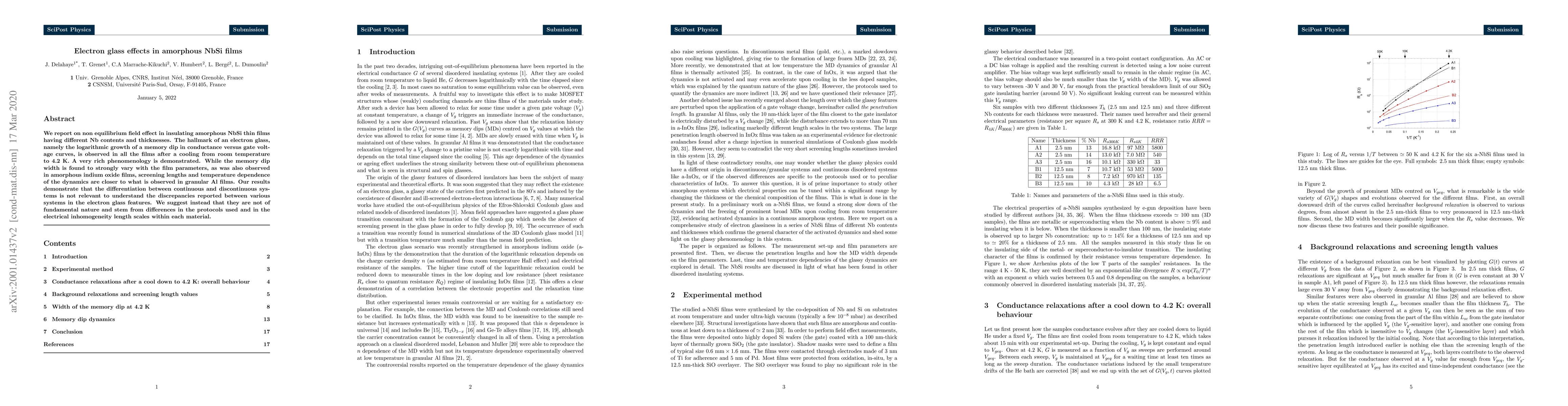 We report on non equilibrium field effect in insulating amorphous NbSi thin films having different Nb contents and thicknesses. The hallmark of an electron glass, namely the logarithmic growth of a memory dip in conductance versus gate voltage curves, is observed in all the films after a cooling from room temperature to 4.2 K. A very rich phenomenology is demonstrated. While the memory dip width is found to strongly vary with the film parameters, as was also observed in amorphous indium oxide films, screening lengths and temperature dependence of the dynamics are closer to what is observed in granular Al films. Our results demonstrate that the differentiation between continuous and discontinuous systems is not relevant to understand the discrepancies reported between various systems in the electron glass features. We suggest instead that they are not of fundamental nature and stem from differences in the protocols used and in the electrical inhomogeneity length scales within each material.
