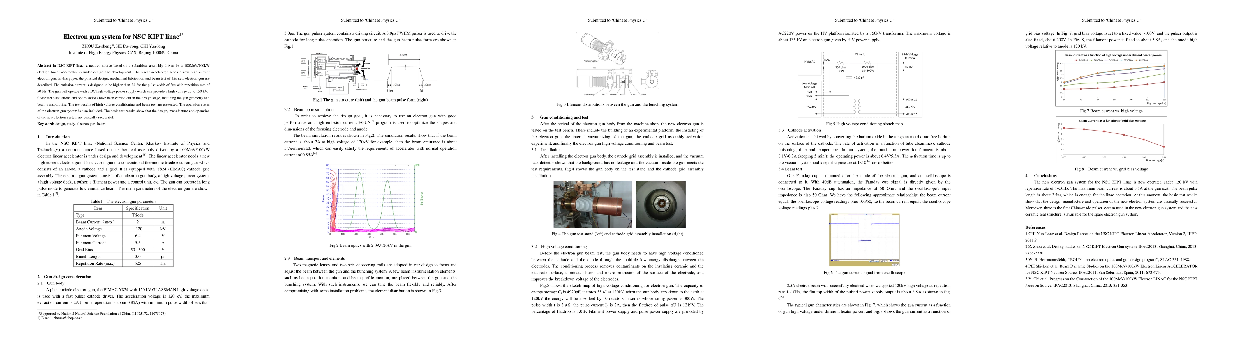 In NSC KIPT linac, a neutron source based on a subcritical assembly driven by a 100MeV/100kW electron linear accelerator is under design and development. The linear accelerator needs a new high current electron gun. In this paper, the physical design, mechanical fabrication and beam test of this new electron gun are described. The emission current is designed to be higher than 2A for the pulse width of 3us with repetition rate of 50 Hz. The gun will operate with a DC high voltage power supply which can provide a high voltage up to 150 kV. . Computer simulations and optimizations have been carried out in the design stage, including the gun geometry and beam transport line. The test results of high voltage conditioning and beam test are presented. The operation status of the electron gun system is also included. The basic test results show that the design, manufacture and operation of the new electron system are basically successful.