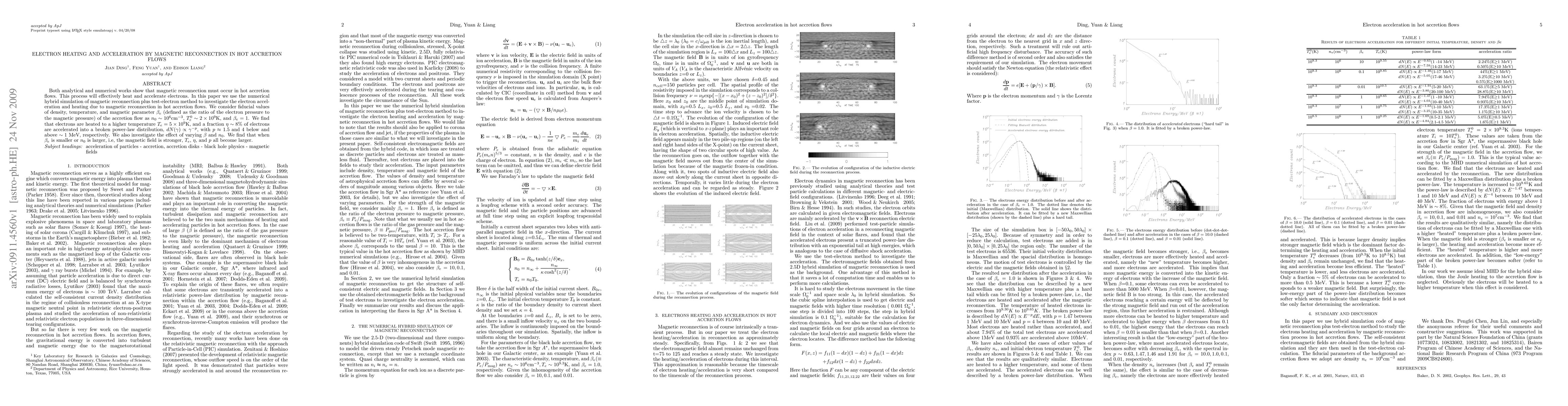 This paper investigates electron heating and acceleration via magnetic reconnection in hot accretion flows using numerical simulations. Results show that electrons are heated to $T_{e}=5\times 10^9$K, with 8% accelerated into a broken power-law distribution, and that stronger magnetic fields increase electron temperature, acceleration fraction, and power-law index.