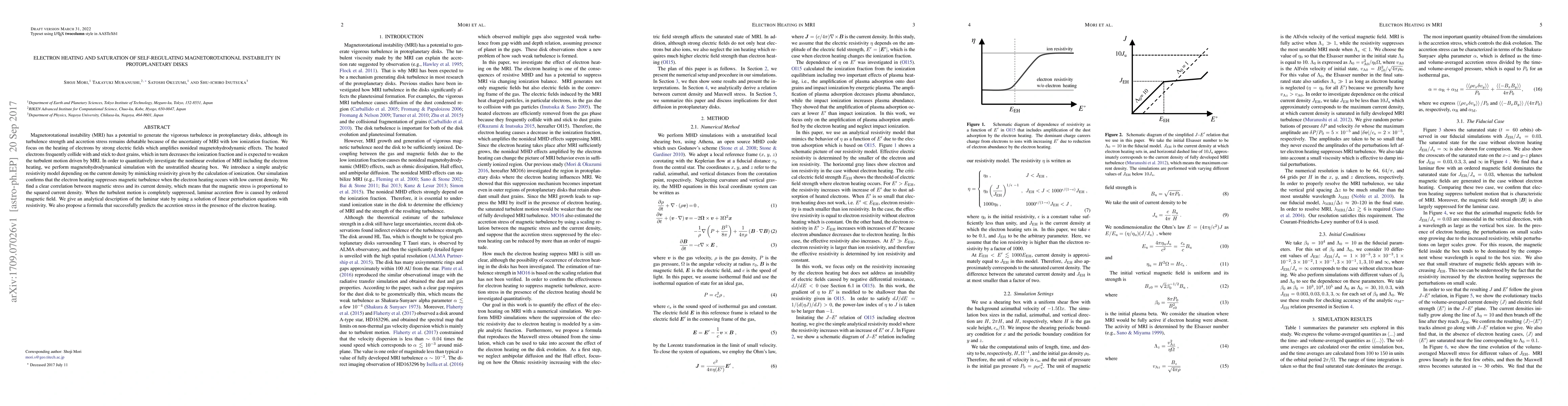 This paper investigates how electron heating due to strong electric fields in protoplanetary disks affects the magnetorotational instability (MRI) and turbulence. Simulations show that electron heating suppresses MRI-driven turbulence when the current density is low, leading to a laminar accretion flow and a proportional relationship between magnetic stress and current density.