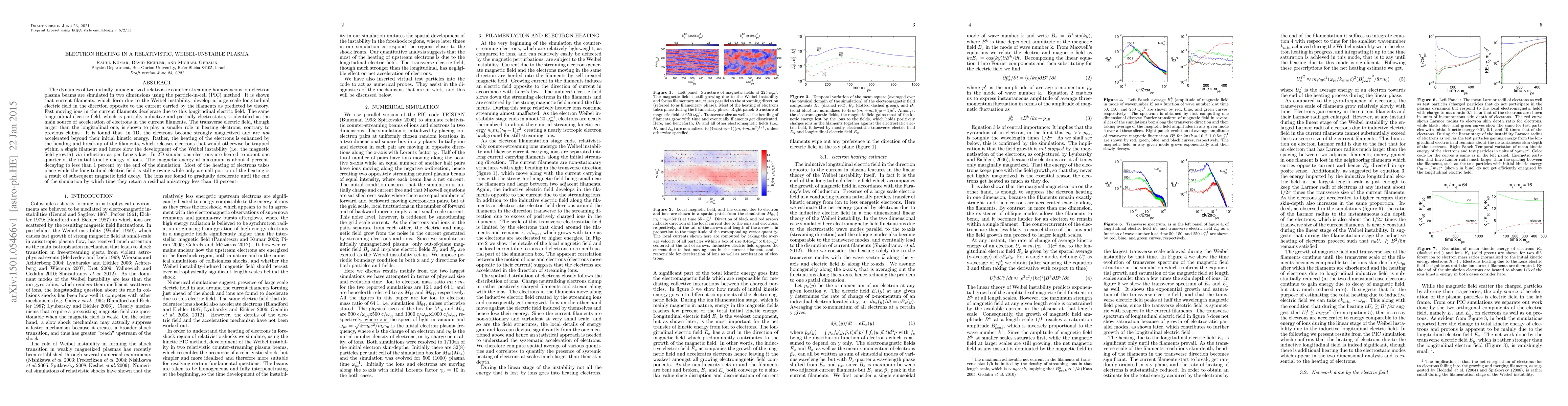 This study investigates the electron heating mechanisms in relativistic, Weibel-unstable plasmas using 2D PIC simulations. It finds that the longitudinal electric field, generated by current filaments due to the Weibel instability, primarily accelerates electrons, while the transverse electric field plays a minor role in heating.