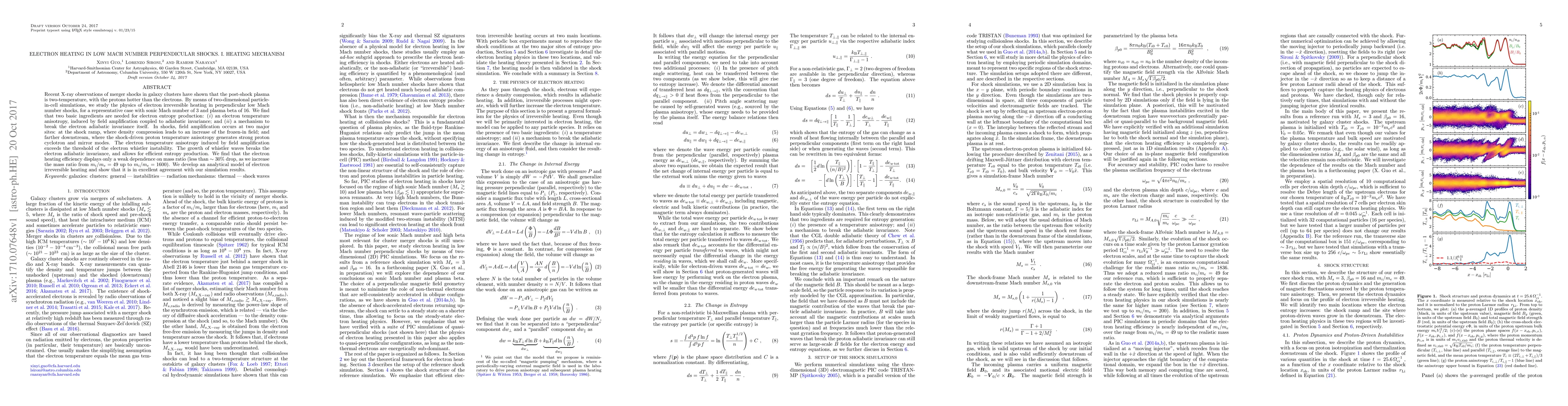 Recent X-ray observations of merger shocks in galaxy clusters have shown that the post-shock plasma is two-temperature, with the protons hotter than the electrons. By means of two-dimensional particle-in-cell simulations, we study the physics of electron irreversible heating in perpendicular low Mach number shocks, for a representative case with sonic Mach number of 3 and plasma beta of 16. We find that two basic ingredients are needed for electron entropy production: (i) an electron temperature anisotropy, induced by field amplification coupled to adiabatic invariance; and (ii) a mechanism to break the electron adiabatic invariance itself. In shocks, field amplification occurs at two major sites: at the shock ramp, where density compression leads to an increase of the frozen-in field; and farther downstream, where the shock-driven proton temperature anisotropy generates strong proton cyclotron and mirror modes. The electron temperature anisotropy induced by field amplification exceeds the threshold of the electron whistler instability. The growth of whistler waves breaks the electron adiabatic invariance, and allows for efficient entropy production. We find that the electron heating efficiency displays only a weak dependence on mass ratio (less than 30 percent drop, as we increase the mass ratio from 49 up to 1600). We develop an analytical model of electron irreversible heating and show that it is in excellent agreement with our simulation results.