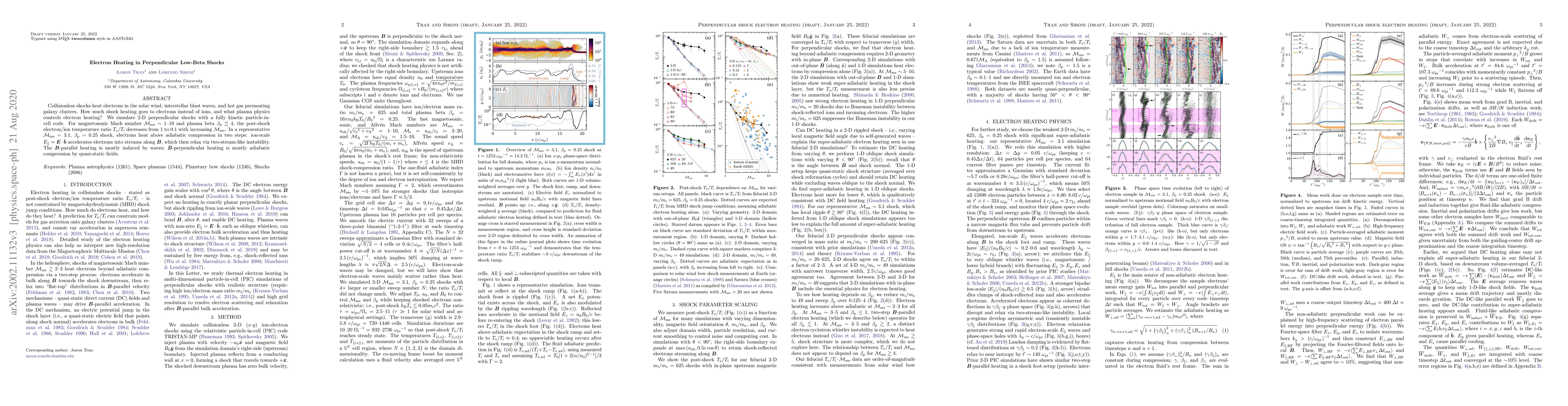 This study investigates electron heating in perpendicular low-beta shocks using kinetic simulations. It finds that electron heating decreases with increasing magnetosonic Mach number, and is primarily driven by parallel electric fields and subsequent instabilities, with perpendicular heating mainly from adiabatic compression.