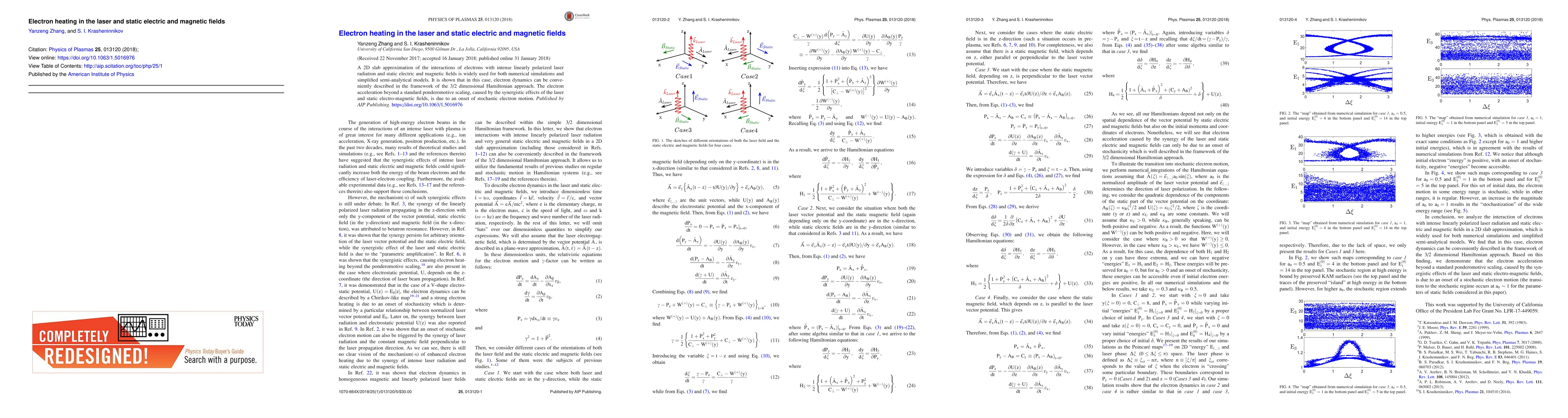 This paper explores electron dynamics in a 2D slab model under the influence of intense laser radiation and static electric and magnetic fields, demonstrating that electron heating can be described using a 3/2 dimensional Hamiltonian approach. The study reveals that synergistic effects of these fields lead to electron acceleration beyond standard scaling, driven by stochastic electron motion.