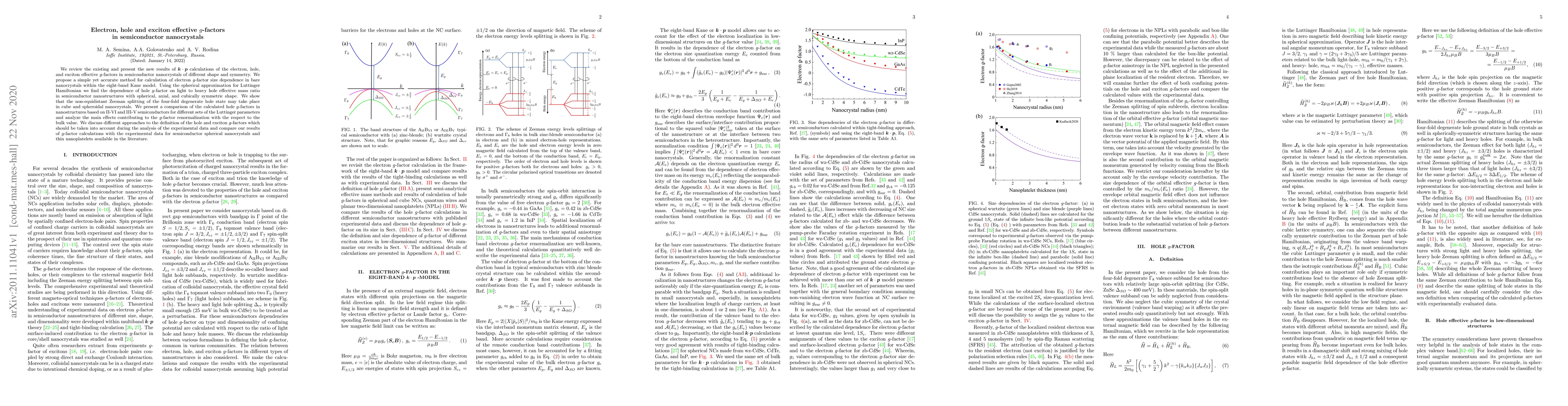 This paper reviews and presents new results on the effective $g$-factors of electrons, holes, and excitons in semiconductor nanocrystals, employing $\bf kp$ calculations and the eight-band Kane model. It highlights the size dependence of electron $g$-factors and the influence of shape on hole $g$-factors, noting non-equidistant Zeeman splitting in certain nanocrystals.