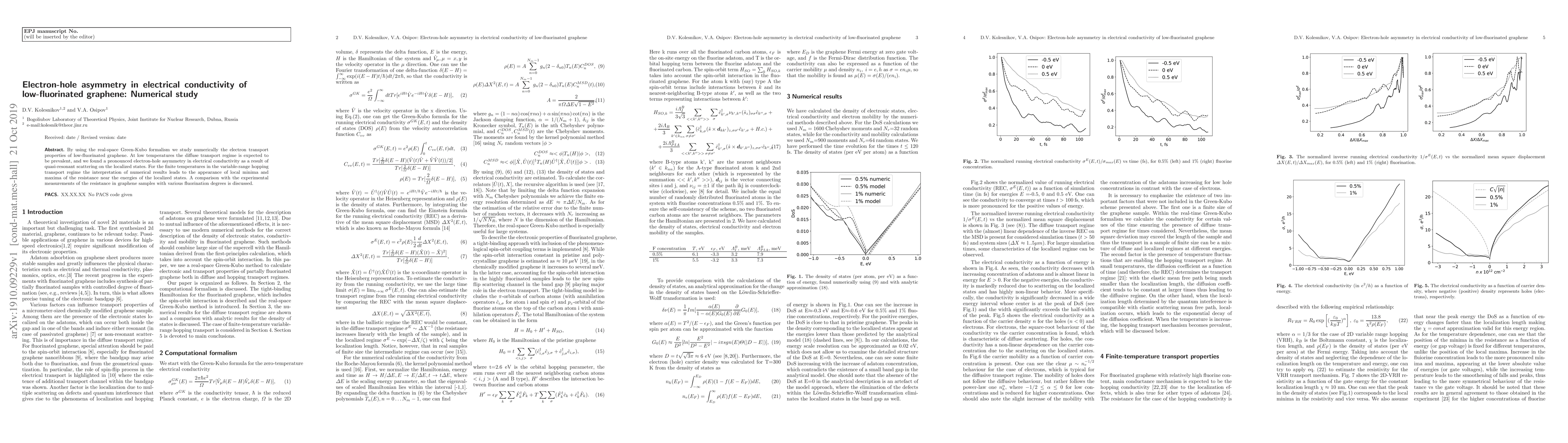 Research shows that low-fluorinated graphene exhibits electron-hole asymmetry in electrical conductivity due to quasi-resonant scattering on localized states, with pronounced effects at low temperatures.