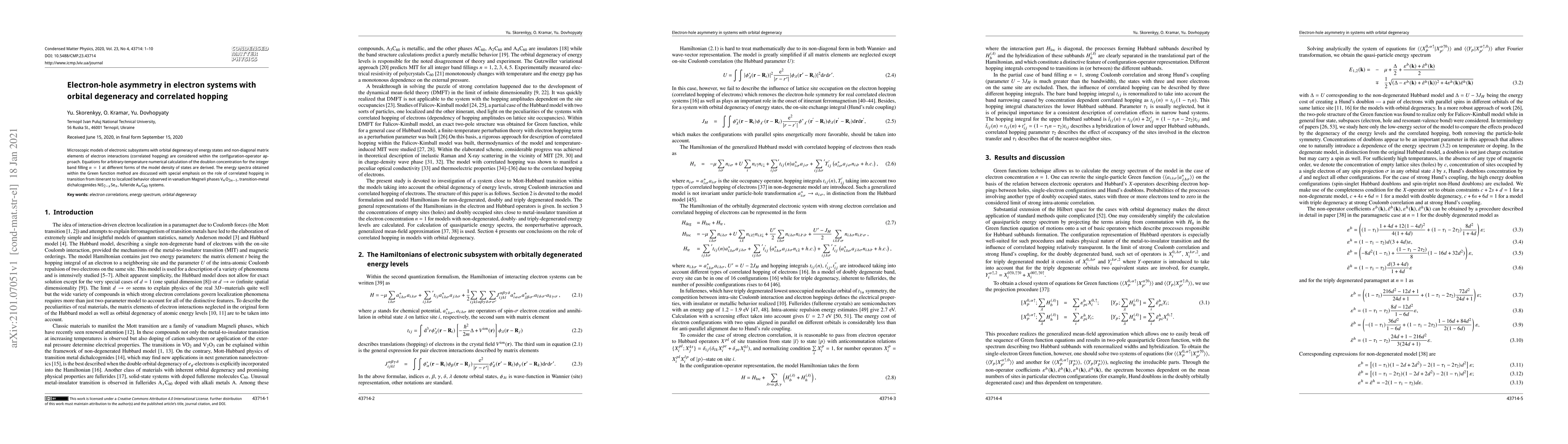 This paper investigates electron-hole asymmetry in systems with orbital degeneracy and correlated hopping using the configuration-operator approach. It derives equations for calculating doublon concentration and analyzes energy spectra, highlighting the effect of correlated hopping on the transition from itinerant to localized behavior in materials like V$_n$O$_{2n-1}$ and NiS$_{2-x}$Se$_x$.