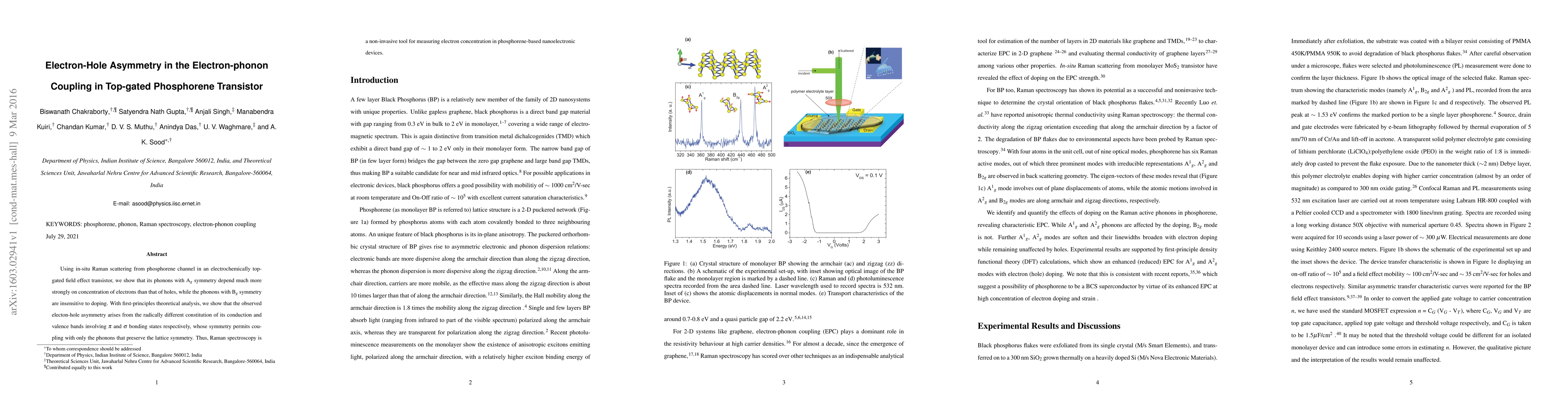 Summary: In-situ Raman scattering reveals electron-hole asymmetry in electron-phonon coupling in top-gated phosphorene transistors, with A$_g$ phonons sensitive to electron concentration and B$_g$ phonons unaffected by doping. Theoretical analysis attributes this to the distinct $\pi$ and $\sigma$ bonding states in the conduction and valence bands, respectively.