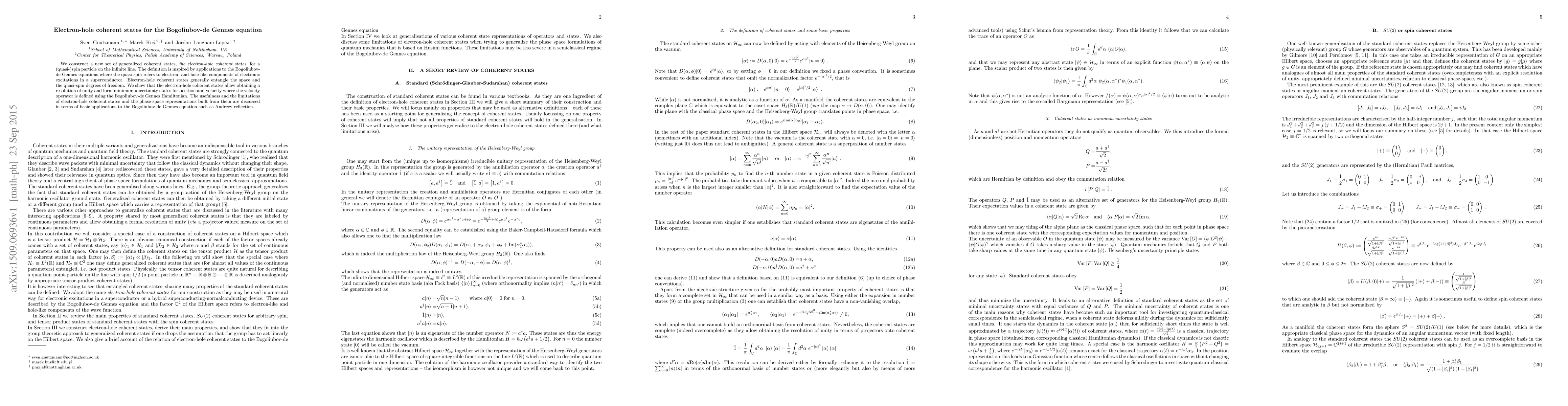 Summary: This paper introduces electron-hole coherent states for quasi-spin particles on an infinite line, inspired by applications to Bogoliubov-de Gennes equations in superconductors. These states provide a resolution of unity and minimum uncertainty for position and velocity, defined via the Bogoliubov-de Gennes Hamiltonian, and are useful for basic applications like Andreev reflection.