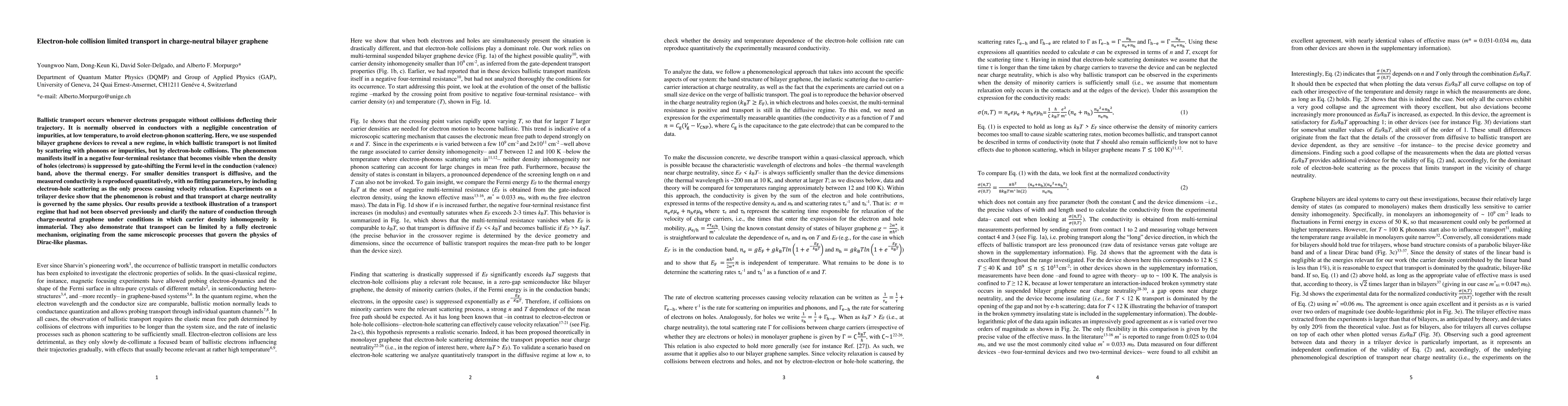 Ballistic transport occurs whenever electrons propagate without collisions deflecting their trajectory. It is normally observed in conductors with a negligible concentration of impurities, at low temperature, to avoid electron-phonon scattering. Here, we use suspended bilayer graphene devices to reveal a new regime, in which ballistic transport is not limited by scattering with phonons or impurities, but by electron-hole collisions. The phenomenon manifests itself in a negative four-terminal resistance that becomes visible when the density of holes (electrons) is suppressed by gate-shifting the Fermi level in the conduction (valence) band, above the thermal energy. For smaller densities transport is diffusive, and the measured conductivity is reproduced quantitatively, with no fitting parameters, by including electron-hole scattering as the only process causing velocity relaxation. Experiments on a trilayer device show that the phenomenon is robust and that transport at charge neutrality is governed by the same physics. Our results provide a textbook illustration of a transport regime that had not been observed previously and clarify the nature of conduction through charge-neutral graphene under conditions in which carrier density inhomogeneity is immaterial. They also demonstrate that transport can be limited by a fully electronic mechanism, originating from the same microscopic processes that govern the physics of Dirac-like plasmas.