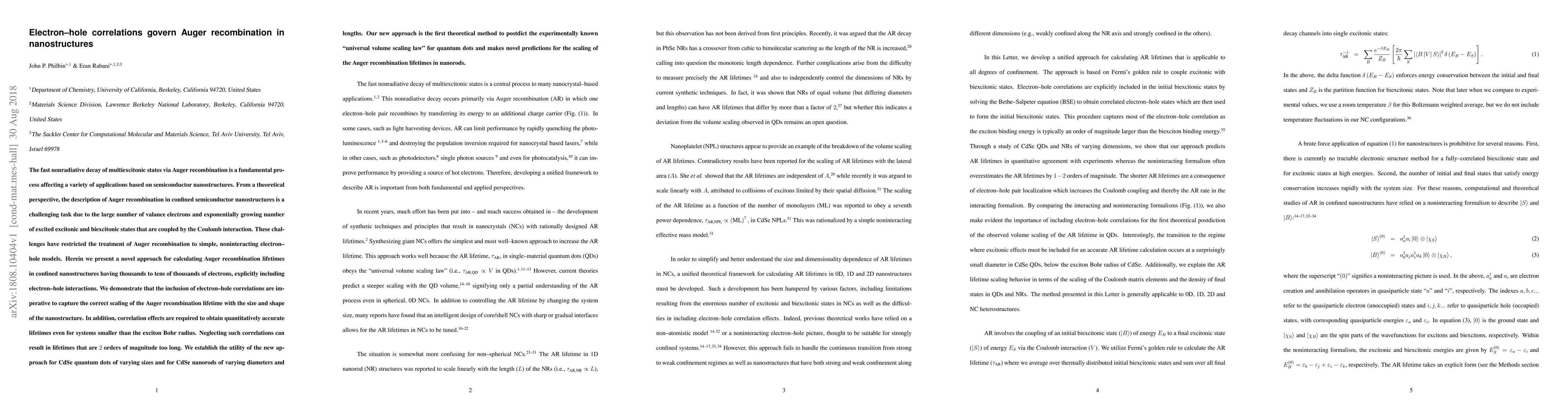 This research presents a novel theoretical approach to calculate Auger recombination lifetimes in semiconductor nanostructures, demonstrating that electron-hole correlations are essential for accurate predictions. The new method captures the correct scaling of recombination lifetimes with nanostructure size and shape, and accurately predicts the experimentally known volume scaling law for quantum dots.
