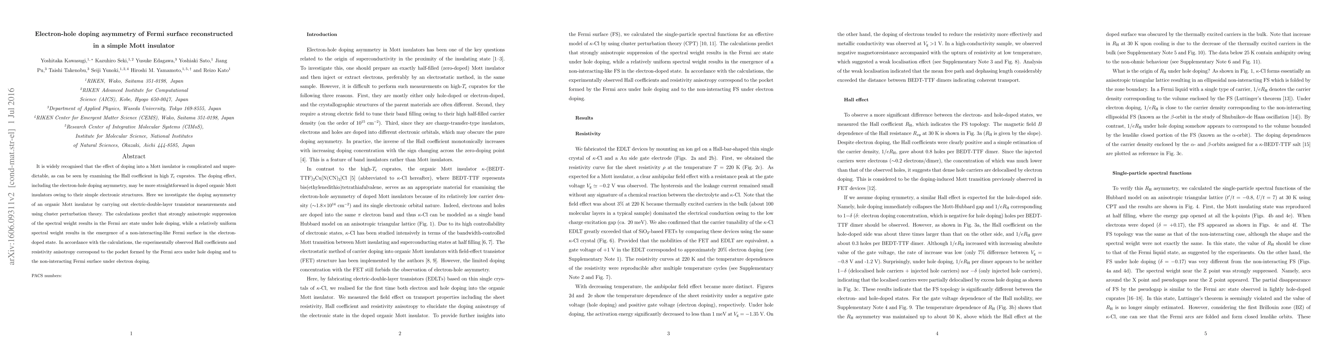 This research investigates the electron-hole doping asymmetry in a simple organic Mott insulator, revealing that hole doping leads to a strongly anisotropic Fermi arc state, while electron doping results in a more uniform, non-interacting-like Fermi surface. Experimental and theoretical results confirm these distinct behaviors.