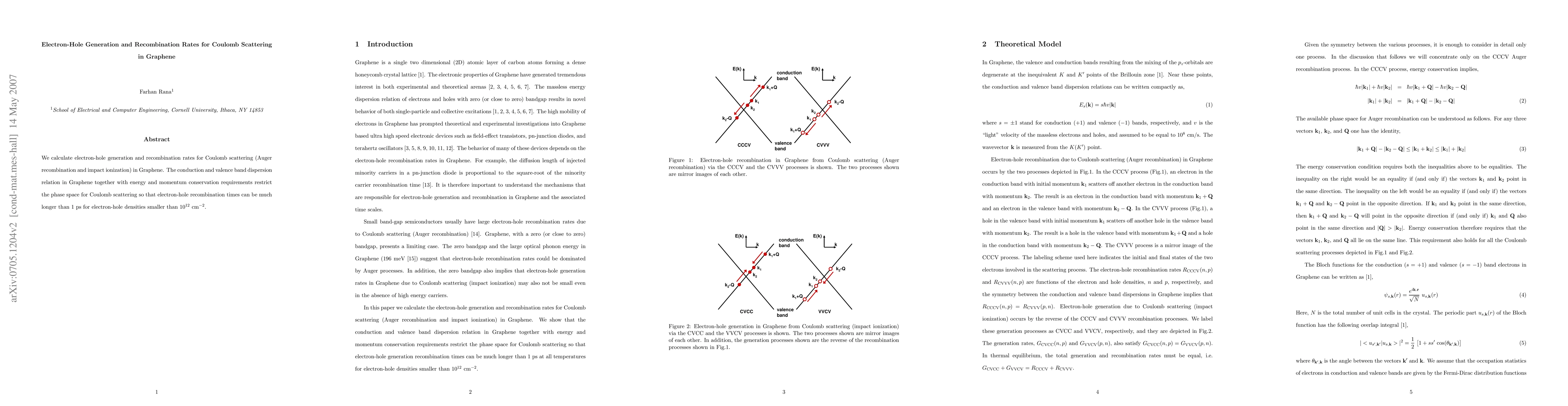 This study calculates the electron-hole generation and recombination rates in graphene due to Coulomb scattering, revealing that recombination times can exceed 1 picosecond for low electron-hole densities, due to restricted phase space from graphene's band structure.