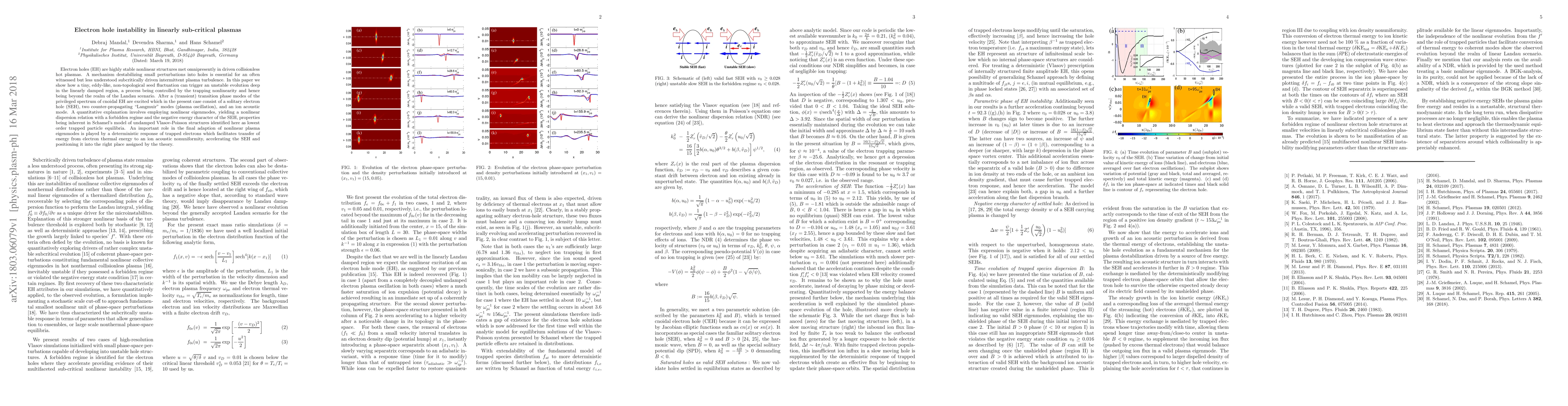 Electron holes (EH) are highly stable non-linear structures met omnipresently in driven collision-less hot plasmas. A mechanism destabilizing small perturbations into holes is essential for an often witnessed but less understood sub-critically driven intermittent plasma turbulence. In this paper we show how a tiny, eddy-like, non-topological seed fluctuation can trigger an unstable evolution deep in the linearly damped region, a process being controlled by the trapping non-linearity and hence being beyond the realm of the Landau scenario. After a (transient) transition phase modes of the privileged spectrum of cnoidal EH are excited which in the present case consist of a solitary electron hole (SEH), two counter-propagating "Langmuir" modes (plasma oscillation), and an ion acoustic mode. A quantitative explanation involves employing non-linear eigen-modes, yielding a non-linear dispersion relation with a forbidden regime and the negative energy character of the SEH, properties being inherent in Schamel's model of undamped Vlasov-Poisson structures identified here as lowest order trapped particle equilibria. An important role in the final adaption of nonlinear plasma eigenmodes is played by a deterministic response of trapped electrons which facilitates transfer of energy from electron thermal energy to an ion acoustic non-uniformity, accelerating the SEH and positioning it into the right place assigned by the theory.