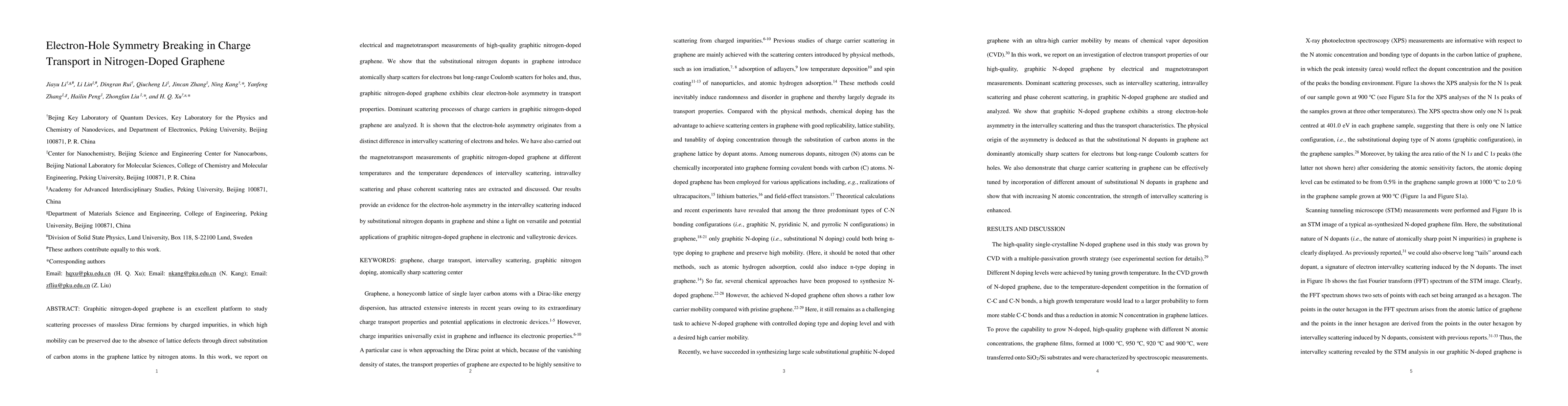 This study investigates the electron-hole symmetry breaking in charge transport in nitrogen-doped graphene, revealing that nitrogen dopants create sharp electron scatters but long-range hole scatters, leading to clear electron-hole asymmetry in transport properties. The research highlights the distinct intervalley scattering differences and provides insights into potential applications in electronic and valleytronic devices.
