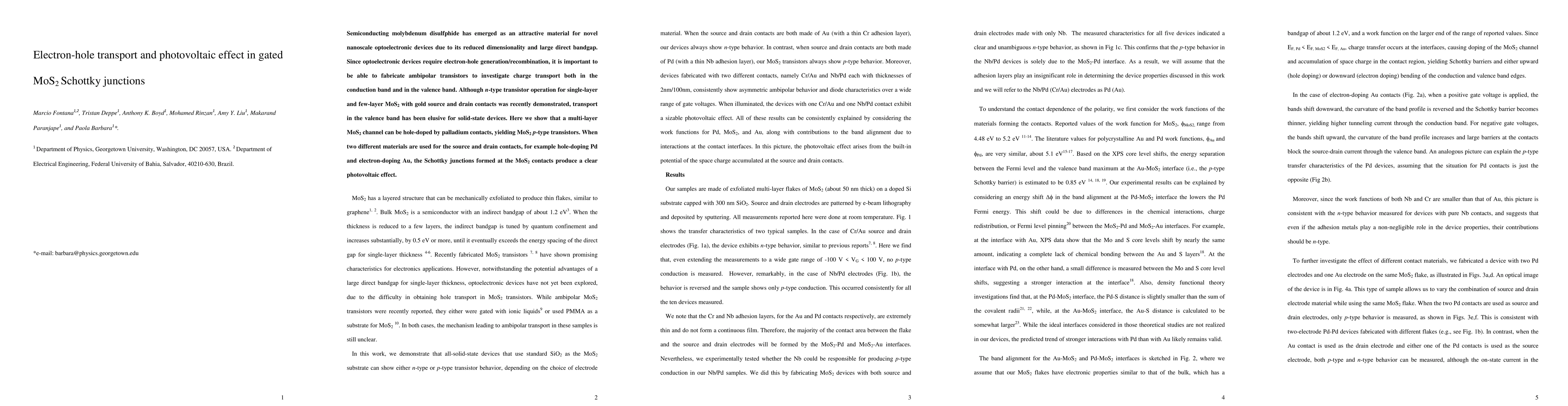 Atomically thin MoS2 has recently emerged as a very attractive material for nanoscale optoelectronic devices. While n-type transport in MoS2 devices has been demonstrated, hole conduction has been more challenging. Here we show work-function engineering to be an effective approach for controlling the polarity of MoS2 devices. Gated multi-layer MoS2 transistors with Au source/drain contacts exhibit n-type operation, while those with Pd contacts are shown to have p-type behavior. Devices with one Au and one Pd contact exhibit asymmetric ambipolar behavior and diode characteristics over a wide range of gate voltage, as well as a sizable photovoltaic effect. We argue that the photovoltaic effect arises from the built-in potential of the space charge accumulated at the source and drain contacts.