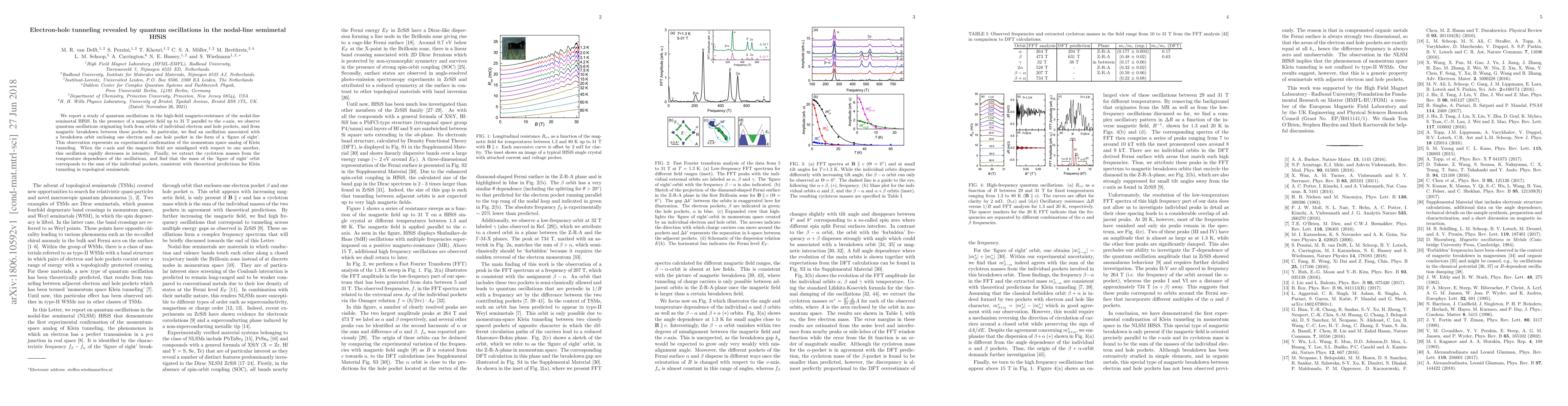 This study observes quantum oscillations in HfSiS, a nodal-line semimetal, revealing electron-hole tunneling via magnetic breakdown, particularly a "figure of eight" orbit, confirming the momentum space analog of Klein tunneling. The oscillation's intensity diminishes when the c-axis and magnetic field are misaligned, aligning with theoretical predictions.