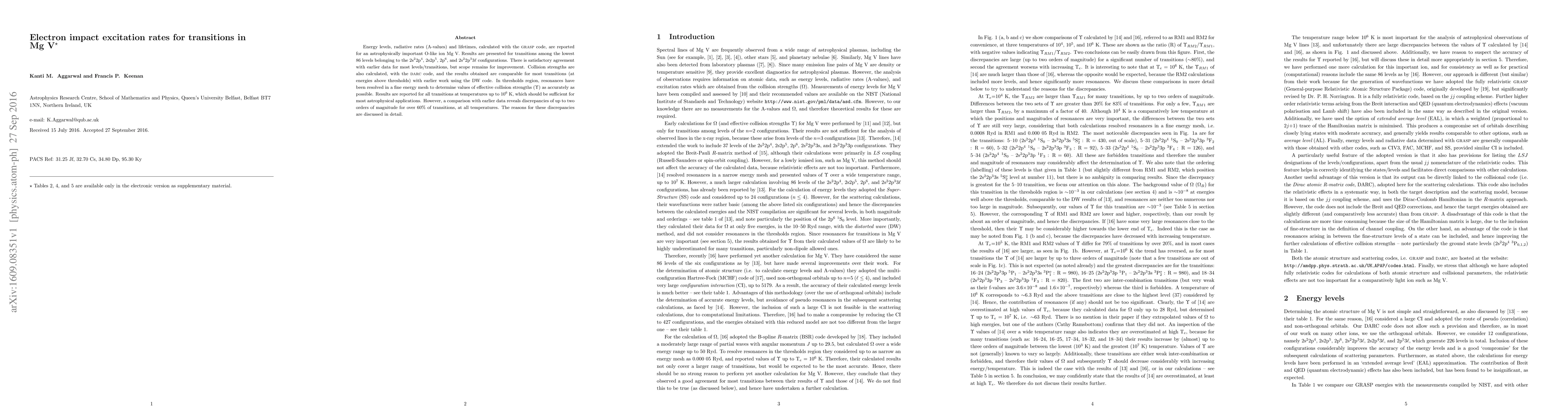 Energy levels, radiative rates (A-values) and lifetimes, calculated with the GRASP code, are reported for an astrophysically important O-like ion Mg~V. Results are presented for transitions among the lowest 86 levels belonging to the 2s$^2$2p$^4$, 2s2p$^5$, 2p$^6$, and 2s$^2$2p$^3$3$\ell$ configurations. There is satisfactory agreement with earlier data for most levels/transitions, but scope remains for improvement. Collision strengths are also calculated, with the DARC code, and the results obtained are comparable for most transitions (at energies above thresholds) with earlier work using the DW code. In thresholds region, resonances have been resolved in a fine energy mesh to determine values of effective collision strengths ($\Upsilon$) as accurately as possible. Results are reported for all transitions at temperatures up to 10$^6$~K, which should be sufficient for most astrophysical applications. However, a comparison with earlier data reveals discrepancies of up to two orders of magnitude for over 60\% of transitions, at all temperatures. The reasons for these discrepancies are discussed in detail.