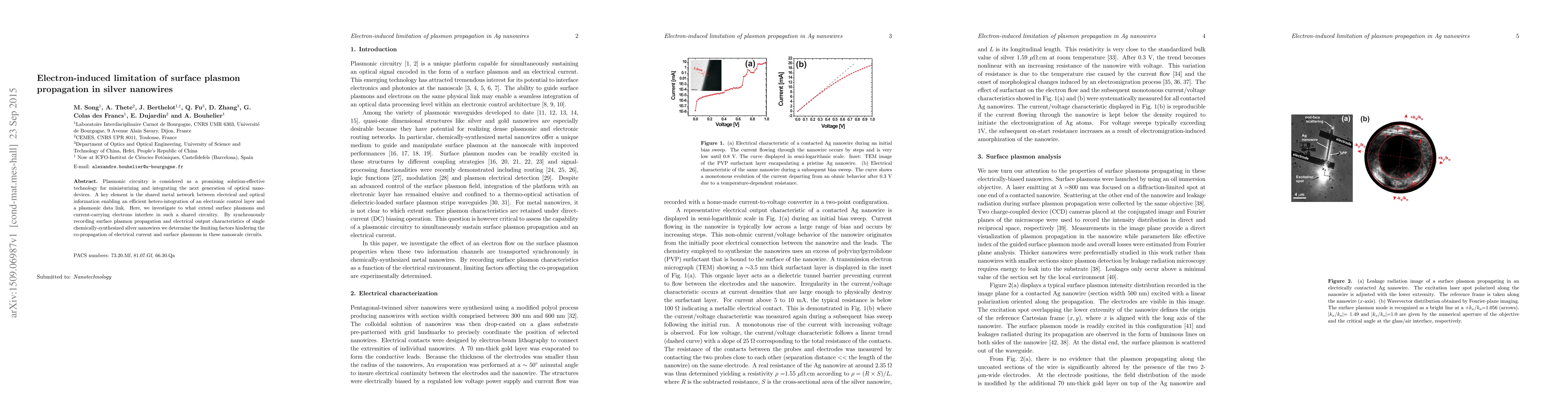 This study investigates how surface plasmons in silver nanowires are affected by the presence of electron currents, determining the factors that limit their co-propagation. The findings reveal the interference between plasmonic circuitry and electrical currents, crucial for the integration of electronic and optical components in nano-devices.