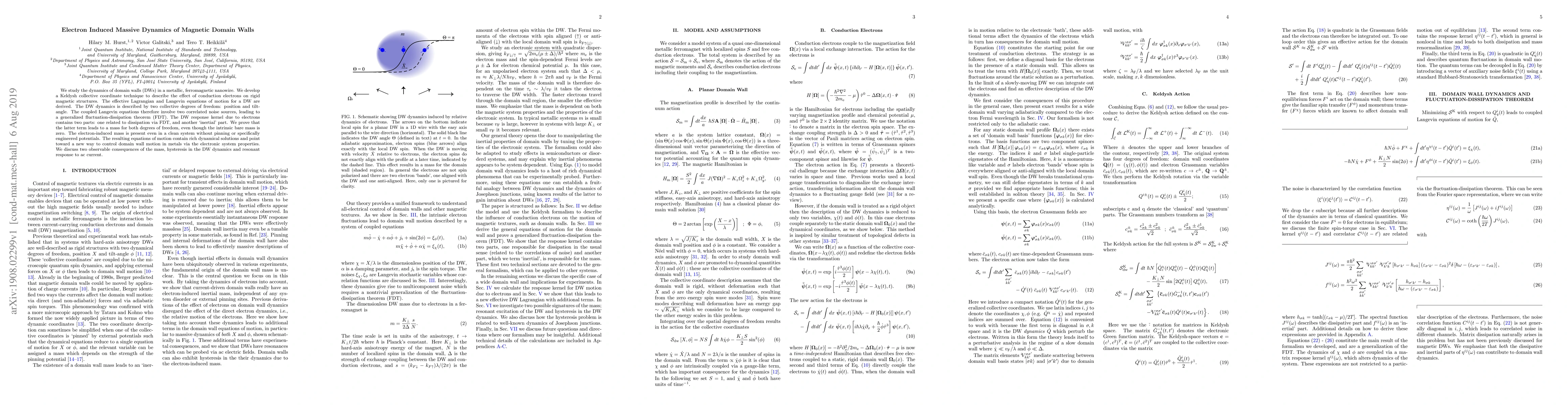 We study the dynamics of domain walls (DWs) in a metallic, ferromagnetic nanowire. We develop a Keldysh collective coordinate technique to describe the effect of conduction electrons on rigid magnetic structures. The effective Lagrangian and Langevin equations of motion for a DW are derived. The DW dynamics is described by two collective degrees of freedom: position and tilt-angle. The coupled Langevin equations therefore involve two correlated noise sources, leading to a generalized fluctuation-dissipation theorem (FDT). The DW response kernel due to electrons contains two parts: one related to dissipation via FDT, and another `inertial' part. We prove that the latter term leads to a mass for both degrees of freedom, even though the intrinsic bare mass is zero. The electron-induced mass is present even in a clean system without pinning or specifically engineered potentials. The resulting equations of motion contain rich dynamical solutions and point toward a new way to control domain wall motion in metals via the electronic system properties. We discuss two observable consequences of the mass, hysteresis in the DW dynamics and resonant response to ac current.