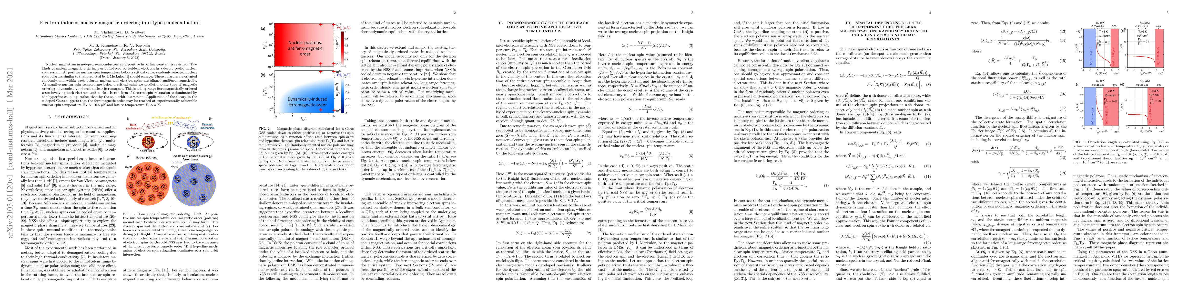This research revisits nuclear magnetism in n-doped semiconductors, revealing two electron-induced nuclear magnetic orderings: randomly oriented nuclear spin polarons at positive nuclear spin temperatures and dynamically induced nuclear ferromagnets at negative nuclear spin temperatures. The study suggests the latter may occur at achievable nuclear spin temperatures around 0.5 μK and lattice temperatures around 5 K.
