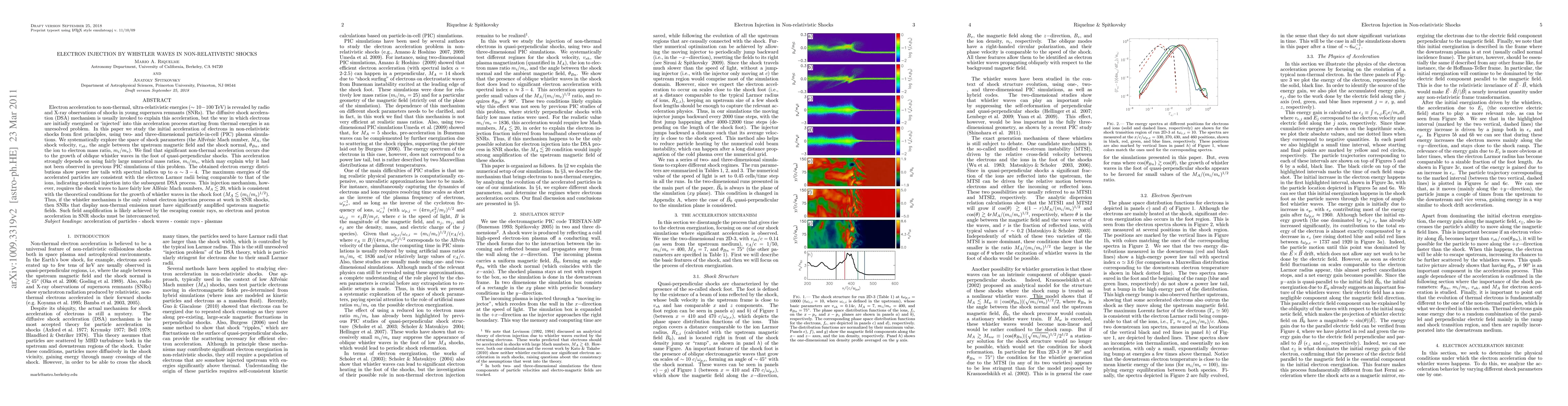 This paper investigates the initial acceleration of electrons in non-relativistic shocks via whistler waves, revealing significant non-thermal acceleration in quasi-perpendicular shocks. The study finds that whistler waves in the shock foot can inject electrons into the diffusive shock acceleration process, provided the shock's Alfv\'enic Mach number is low, suggesting a connection between electron and proton acceleration in supernova remnants.