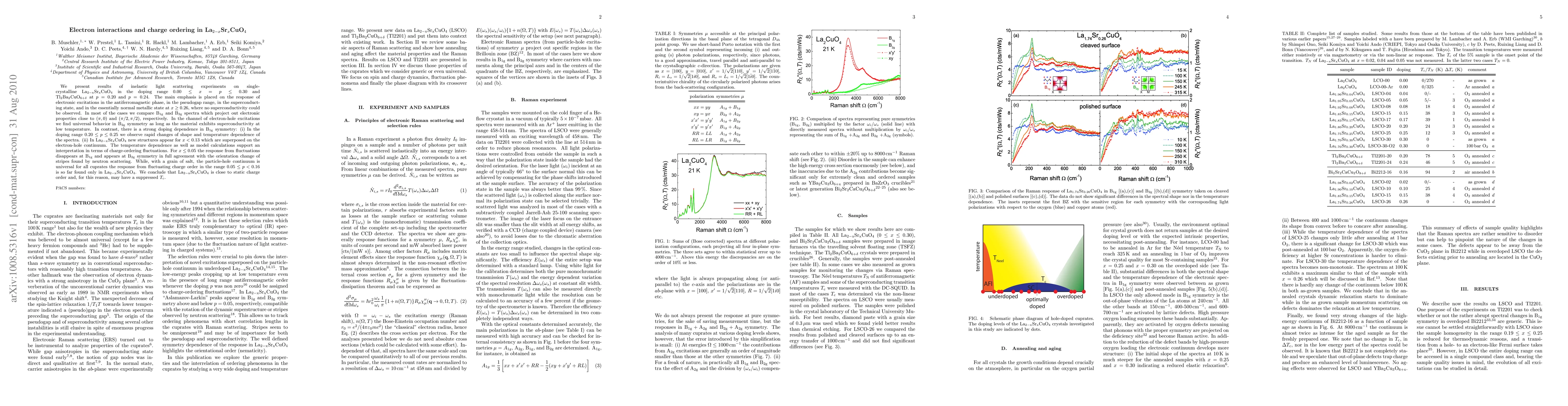 The study investigates electron interactions and charge ordering in La$_{2-x}$Sr$_x$CuO$_4$ through inelastic light scattering, showing universal behavior in superconducting states and significant charge-ordering fluctuations in non-superconducting doping ranges. La$_{2-x}$Sr$_{x}$CuO$_4$ exhibits suppressed $T_c$ due to proximity to static charge order.