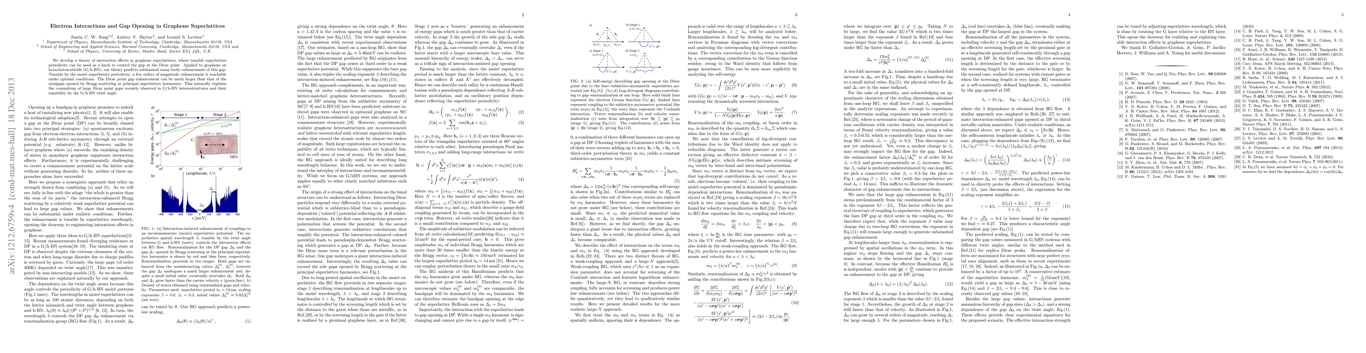This paper develops a theoretical framework for understanding electron interactions in graphene superlattices, showing that the tunable superlattice periodicity can significantly enhance the gap at the Dirac point. The study predicts substantial many-body effects, potentially leading to a few orders of magnitude enhancement in the gap, which can explain the large and tunable Dirac point gaps observed in graphene on hexa-boron-nitride heterostructures.