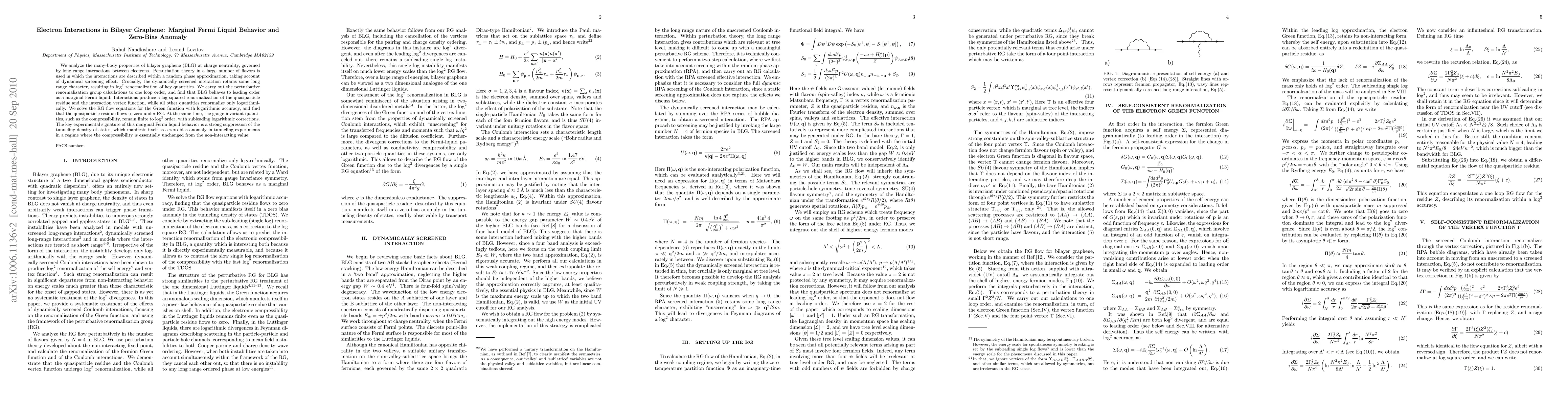 We analyze the many-body properties of bilayer graphene (BLG) at charge neutrality, governed by long range interactions between electrons. Perturbation theory in a large number of flavors is used in which the interactions are described within a random phase approximation, taking account of dynamical screening effect. Crucially, the dynamically screened interaction retains some long range character, resulting in $\log^2$ renormalization of key quantities. We carry out the perturbative renormalization group calculations to one loop order, and find that BLG behaves to leading order as a marginal Fermi liquid. Interactions produce a log squared renormalization of the quasiparticle residue and the interaction vertex function, while all other quantities renormalize only logarithmically. We solve the RG flow equation for the Green function with logarithmic accuracy, and find that the quasiparticle residue flows to zero under RG. At the same time, the gauge invariant quantities, such as the compressibility, remain finite to $\log^2$ order, with subleading logarithmic corrections. The key experimental signature of this marginal Fermi liquid behavior is a strong suppression of the tunneling density of states, which manifests itself as a zero bias anomaly in tunneling experiments in a regime where the compressibility is essentially unchanged from the non-interacting value.
