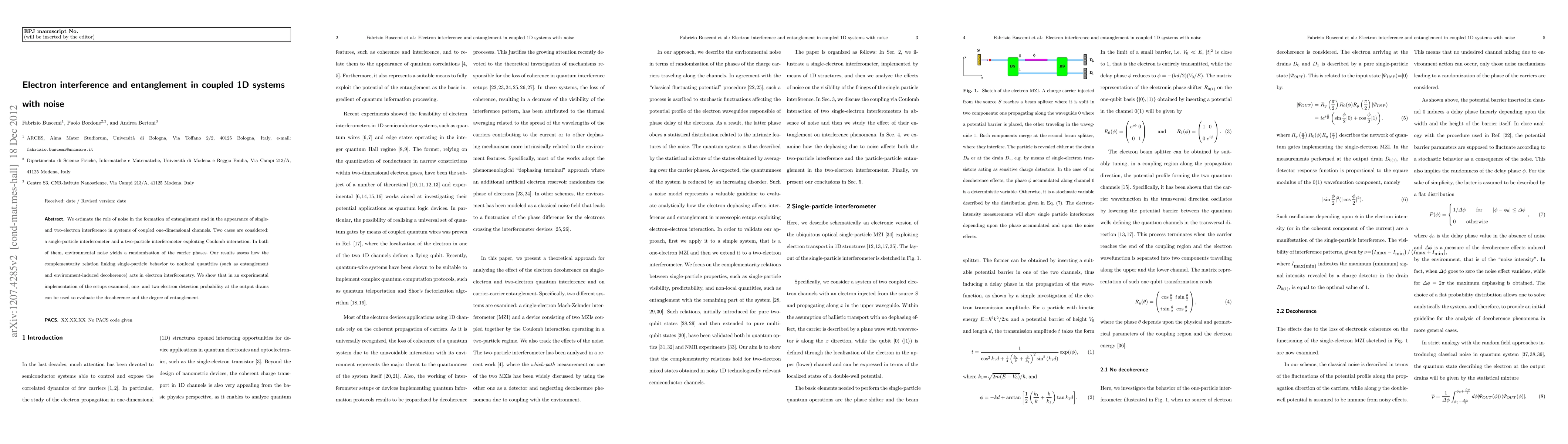 This paper investigates the impact of environmental noise on entanglement and interference in coupled 1D semiconductor systems, focusing on both single- and two-particle interferometers. It demonstrates that noise randomizes carrier phases, affecting both interference patterns and decoherence, while highlighting the use of electron detection probabilities to measure these effects.