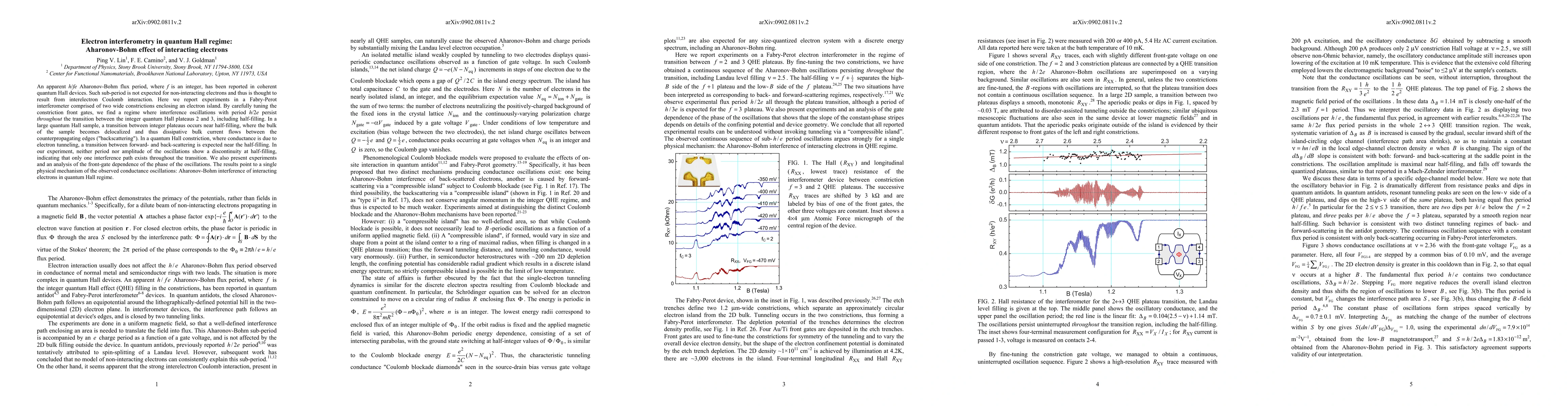 An apparent h/fe Aharonov-Bohm flux period, where f is an integer, has been reported in coherent quantum Hall devices. Such sub-period is not expected for non-interacting electrons and thus is thought to result from interelectron Coulomb interaction. Here we report experiments in a Fabry-Perot interferometer comprised of two wide constrictions enclosing an electron island. By carefully tuning the constriction front gates, we find a regime where interference oscillations with period h/2e persist throughout the transition between the integer quantum Hall plateaus 2 and 3, including half-filling. In a large quantum Hall sample, a transition between integer plateaus occurs near half-filling, where the bulk of the sample becomes delocalized and thus dissipative bulk current flows between the counterpropagating edges ("backscattering"). In a quantum Hall constriction, where conductance is due to electron tunneling, a transition between forward- and back-scattering is expected near the half-filling. In our experiment, neither period nor amplitude of the oscillations show a discontinuity at half-filling, indicating that only one interference path exists throughout the transition. We also present experiments and an analysis of the front-gate dependence of the phase of the oscillations. The results point to a single physical mechanism of the observed conductance oscillations: Aharonov-Bohm interference of interacting electrons in quantum Hall regime.