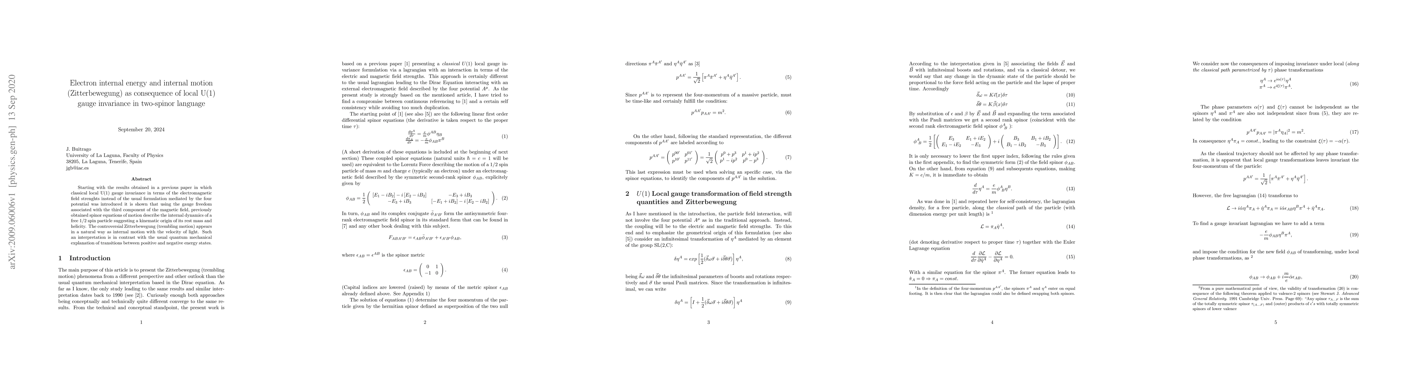 This research demonstrates that the internal dynamics of a free 1/2 spin particle, including its rest mass and helicity, can be derived from classical local U(1) gauge invariance using spinor equations. The Zitterbewegung emerges naturally as an internal motion at the speed of light, contrasting traditional quantum mechanical interpretations.