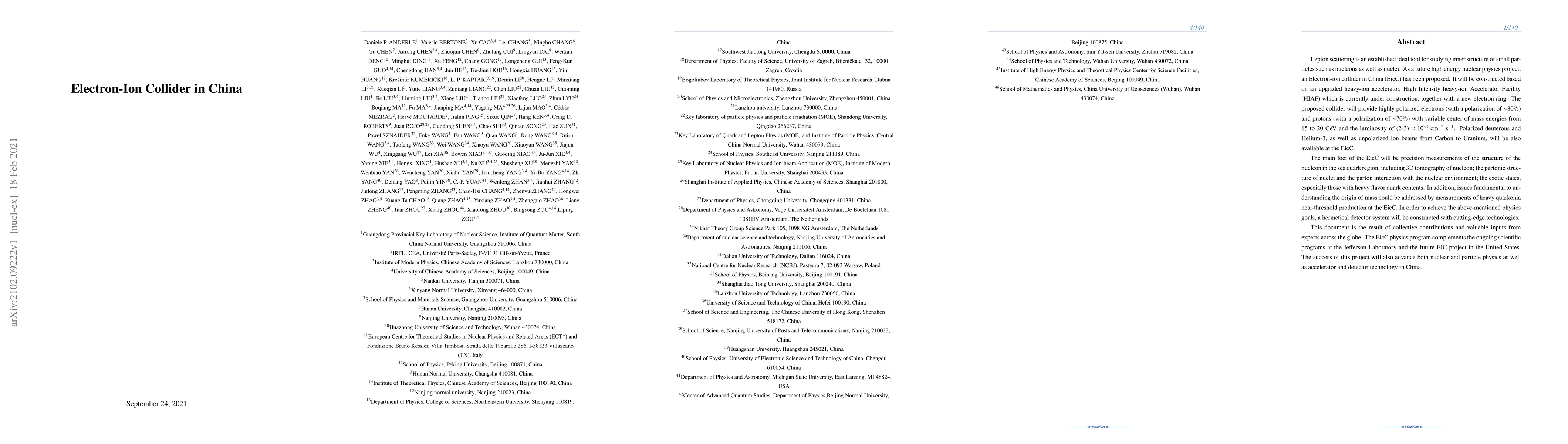 The proposed Electron-Ion Collider in China (EicC) aims to study the inner structure of nucleons and nuclei through lepton scattering, utilizing highly polarized electrons and protons. The EicC will complement existing projects and advance nuclear and particle physics in China.