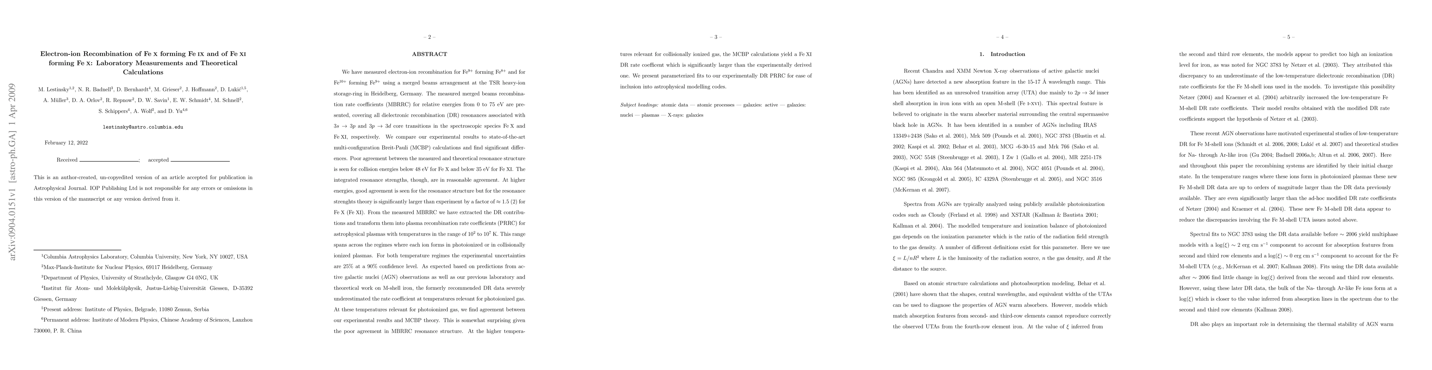 This paper reports laboratory measurements of electron-ion recombination rates for Fe$^{9+}$ forming Fe$^{8+}$ and Fe$^{10+}$ forming Fe$^{9+}$ using merged beams, comparing results to multi-configuration Breit-Pauli calculations. The study finds significant discrepancies between experimental data and theoretical predictions, especially at high temperatures relevant for collisionally ionized plasmas.