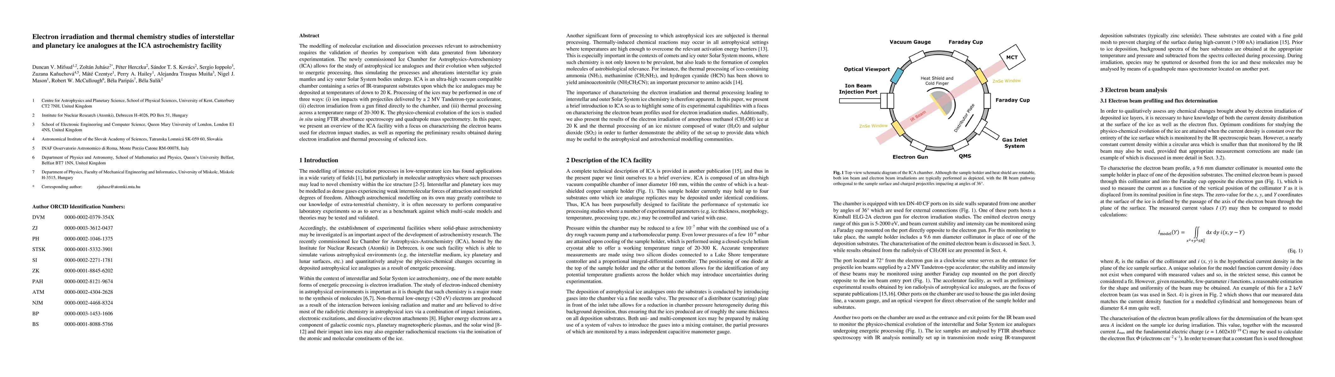 The modelling of molecular excitation and dissociation processes relevant to astrochemistry requires the validation of theories by comparison with data generated from laboratory experimentation. The newly commissioned Ice Chamber for Astrophysics-Astrochemistry (ICA) allows for the study of astrophysical ice analogues and their evolution when subjected to energetic processing, thus simulating the processes and alterations interstellar icy grain mantles and icy outer Solar System bodies undergo. ICA is an ultra-high vacuum compatible chamber containing a series of IR-transparent substrates upon which the ice analogues may be deposited at temperatures of down to 20 K. Processing of the ices may be performed in one of three ways: (i) ion impacts with projectiles delivered by a 2 MV Tandetron-type accelerator, (ii) electron irradiation from a gun fitted directly to the chamber, and (iii) thermal processing across a temperature range of 20-300 K. The physico-chemical evolution of the ices is studied in situ using FTIR absorbance spectroscopy and quadrupole mass spectrometry. In this paper, we present an overview of the ICA facility with a focus on characterising the electron beams used for electron impact studies, as well as reporting the preliminary results obtained during electron irradiation and thermal processing of selected ices.
