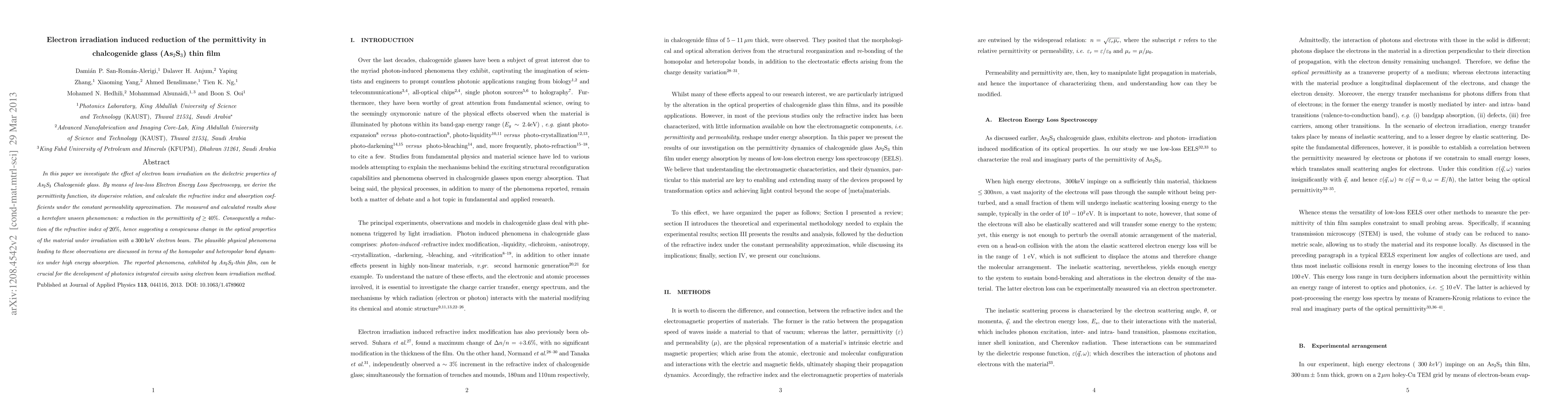 We investigate the effect of electron beam irradiation on the dielectric properties of As2S3 Chalcogenide glass. By means of low-loss Electron Energy Loss Spectroscopy, we derive the permittivity function, its dispersive relation, and calculate the refractive index and absorption coefficients under the constant permeability approximation. The measured and calculated results show, to the best of our knowledge, a heretofore unseen phenomenon: the reduction in the permittivity of <40%, and consequently a modification of the refractive index follows, reducing it by 20%, hence suggesting a significant change on the optical properties of the material. The plausible physical phenomena leading to these observations are discussed in terms of the homopolar and heteropolar bond dynamics under high energy absorption.