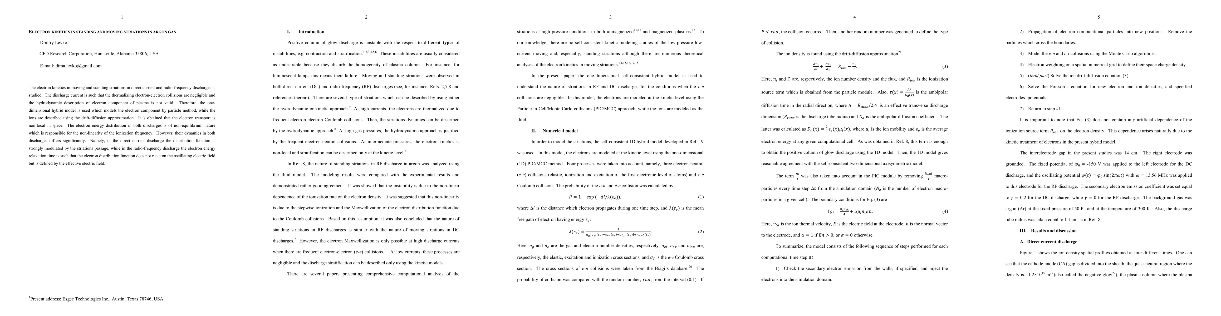 This research employs a one-dimensional hybrid model to study electron kinetics in standing and moving striations in argon gas discharges, finding non-local electron transport and non-equilibrium energy distributions. The direct current discharge shows strong distribution function modulation by striations, while the radio-frequency discharge exhibits electron behavior determined by an effective electric field, not the oscillating field.