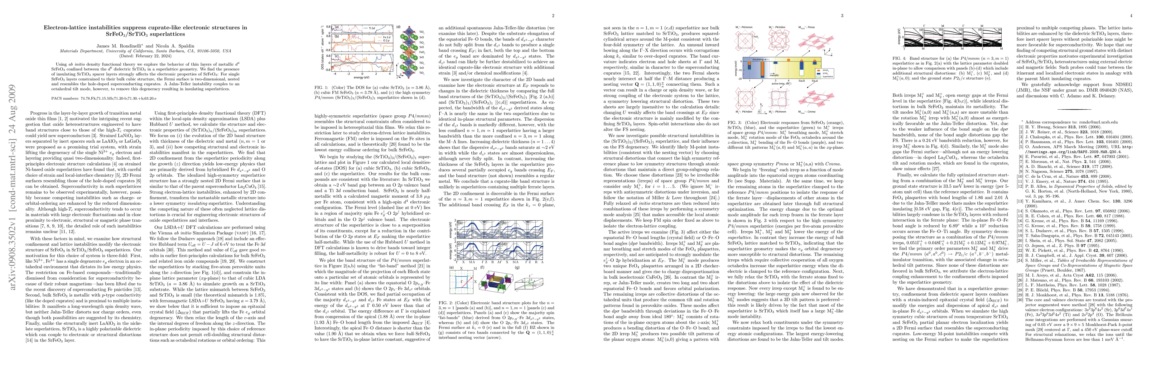 Using {\it ab initio} density functional theory we explore the behavior of thin layers of metallic $d^4$ SrFeO$_3$ confined between the $d^0$ dielectric SrTiO$_3$ in a superlattice geometry. We find the presence of insulating SrTiO$_3$ spacer layers strongly affects the electronic properties of SrFeO$_3$: For single SrFeO$_3$ layers constrained to their bulk cubic structure, the Fermi surface is two-dimensional, nested and resembles the hole-doped superconducting cuprates. A Jahn-Teller instability couples to an octahedral tilt mode, however, to remove this degeneracy resulting in insulating superlattices.