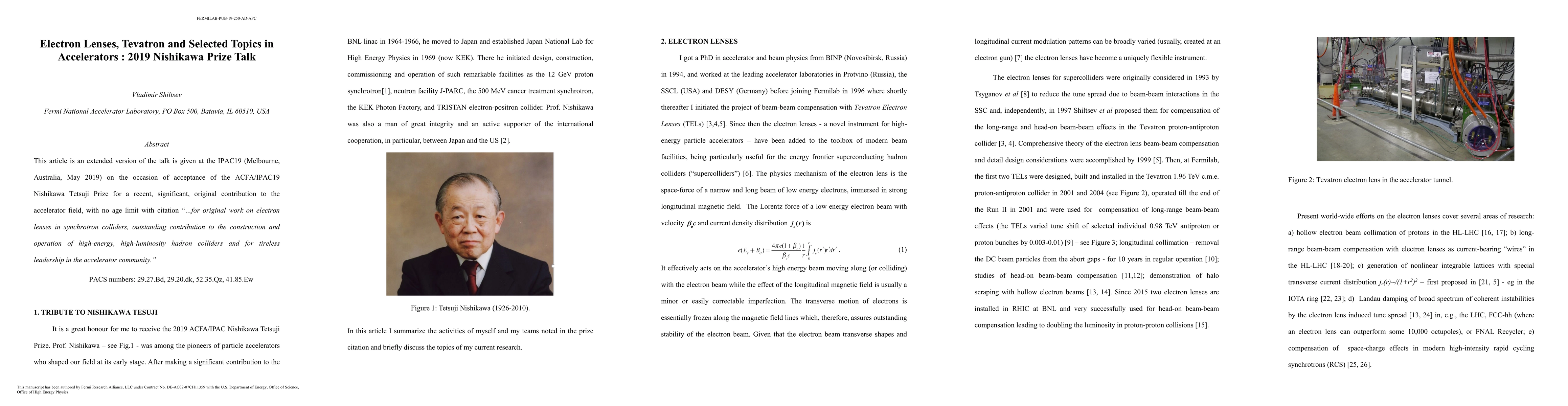 This article summarizes the Nishikawa Prize acceptance talk delivered at IPAC19, highlighting significant contributions to electron lenses in synchrotron colliders, the construction of high-energy hadron colliders, and leadership in the accelerator community. The author's work has greatly advanced accelerator technology and its applications.