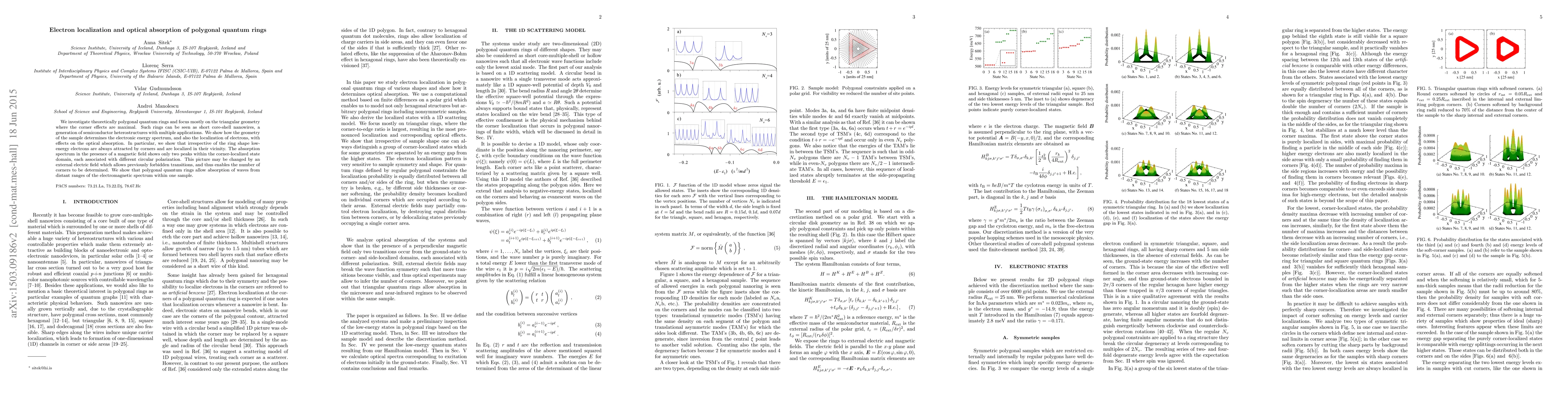 We investigate theoretically polygonal quantum rings and focus mostly on the triangular geometry where the corner effects are maximal. Such rings can be seen as short core-shell nanowires, a generation of semiconductor heterostructures with multiple applications. We show how the geometry of the sample determines the electronic energy spectrum, and also the localization of electrons, with effects on the optical absorption. In particular, we show that irrespective of the ring shape low-energy electrons are always attracted by corners and are localized in their vicinity. The absorption spectrum in the presence of a magnetic field shows only two peaks within the corner-localized state domain, each associated with different circular polarization. This picture may be changed by an external electric field which allows previously forbidden transitions, and thus enables the number of corners to be determined. We show that polygonal quantum rings allow absorption of waves from distant ranges of the electromagnetic spectrum within one sample.