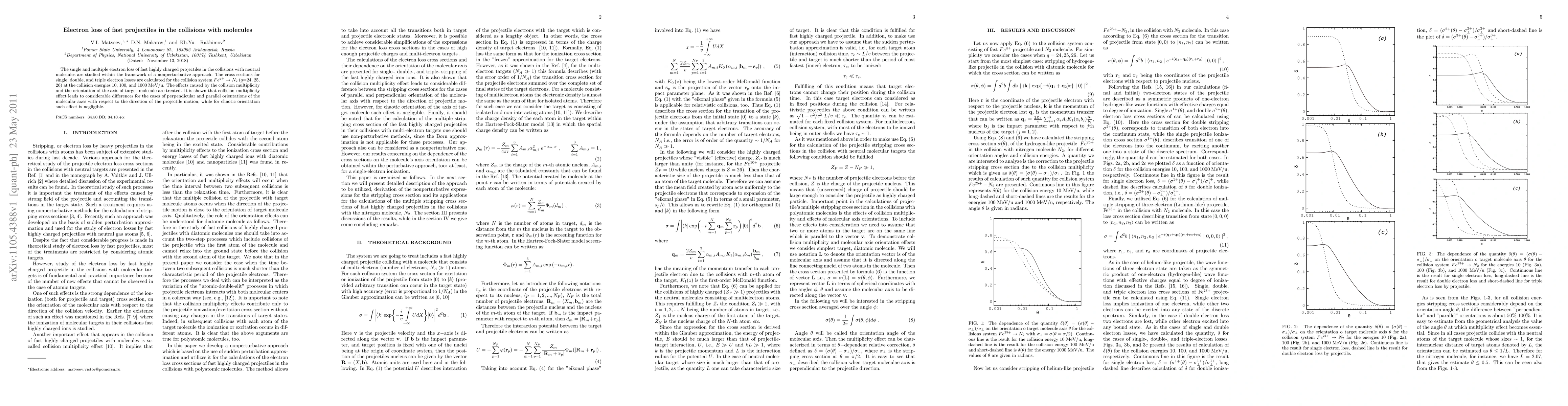 The single and multiple electron loss of fast highly charged projectiles in the collisions with neutral molecules are studied within the framework of a nonperturbative approach. The cross sections for single, double, and triple electron losses are calculated for the collision system $Fe^{q+}\to N_2$ ($q$=24, 25, 26) at the collision energies 10, 100, and 1000 MeV/u. The effects caused by the collision multiplicity and the orientation of the axis of target molecule are treated. It is shown that collision multiplicity effect leads to considerable differences for the cases of perpendicular and parallel orientations of the molecular axes with respect to the direction of the projectile motion, while for chaotic orientation such effect is negligible.