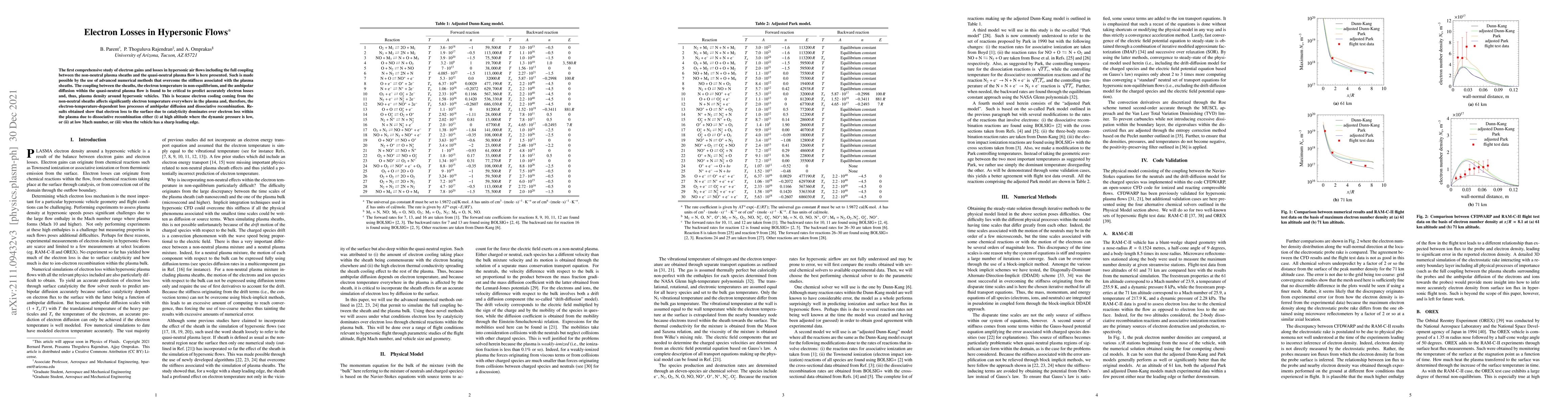 This paper presents a comprehensive study on electron gains and losses in hypersonic air flows, emphasizing the critical coupling between plasma sheaths and quasi-neutral plasma flow. Advanced numerical methods reveal that electron cooling from sheaths significantly impacts electron temperature and loss processes, with surface-related losses dominating under specific conditions.