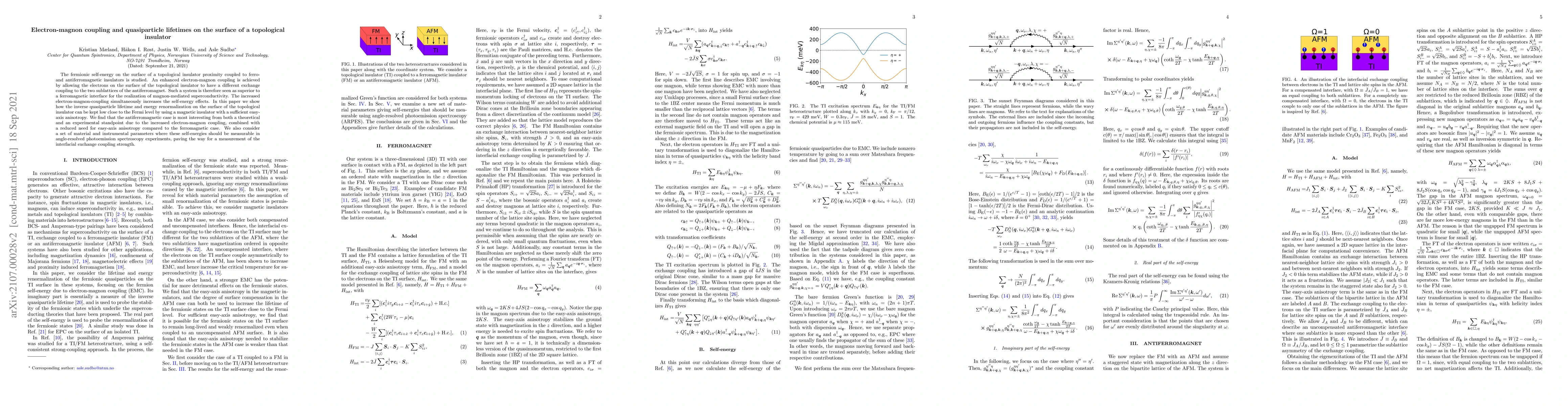 The fermionic self-energy on the surface of a topological insulator proximity coupled to ferro- and antiferromagnetic insulators is studied. An enhanced electron-magnon coupling is achieved by allowing the electrons on the surface of the topological insulator to have a different exchange coupling to the two sublattices of the antiferromagnet. Such a system is therefore seen as superior to a ferromagnetic interface for the realization of magnon-mediated superconductivity. The increased electron-magnon-coupling simultaneously increases the self-energy effects. In this paper we show how the inverse quasiparticle lifetime and energy renormalization on the surface of the topological insulator can be kept low close to the Fermi level by using a magnetic insulator with a sufficient easy-axis anisotropy. We find that the antiferromagnetic case is most interesting from both a theoretical and an experimental standpoint due to the increased electron-magnon coupling, combined with a reduced need for easy-axis anisotropy compared to the ferromagnetic case. We also consider a set of material and instrumental parameters where these self-energies should be measurable in angle-resolved photoemission spectroscopy experiments, paving the way for a measurement of the interfacial exchange coupling strength.
