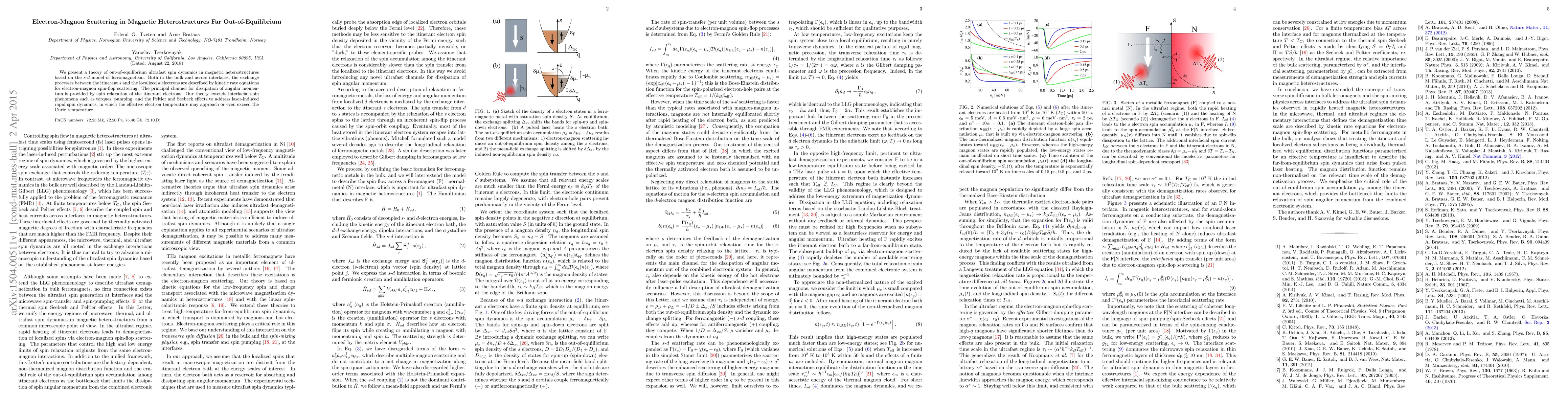 We present a theory of out-of-equilibrium ultrafast spin dynamics in magnetic heterostructures based on the s-d model of ferromagnetism. Both in the bulk and across interfaces, the exchange processes between the itinerant s and the localized d electrons are described by kinetic rate equations for electron-magnon spin-flop scattering. The principal channel for dissipation of angular momentum is provided by spin relaxation of the itinerant electrons. Our theory extends interfacial spin phenomena such as torques, pumping, and the Peltier and Seebeck effects to address laser-induced rapid spin dynamics, in which the effective electron temperature may approach or even exceed the Curie temperature.