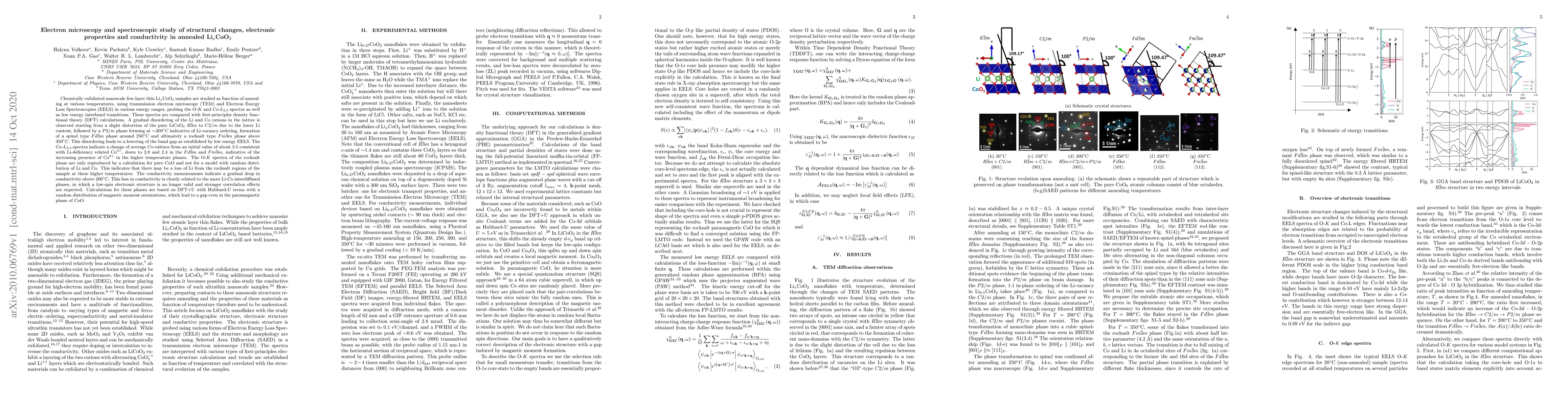 Chemically exfoliated nanoscale few-layer thin Li$_x$CoO$_2$ samples are studied as function of annealing at various temperatures, using transmission electron microscopy (TEM) and Electron Energy Loss Spectroscopies (EELS), probing the O-K, Co-L$_{2,3}$ spectra along with low energy interband transitions. These spectra are compared with first-principles DFT calculations of -Im$[\varepsilon^{-1}(q,\omega)]$ and O-2p Partial Densities of States weighted by dipole matrix elements with the core wavefunction and including the O-1s core-hole and with known trends of the L$_2$/L$_3$ peak ratio to average Co valence. Trends in these spectra under the annealing procedures are established and correlated with the structural phase changes observed from diffraction TEM and High Resolution TEM images. The results are also correlated with conductivity measurements on samples subjected to the same annealing procedures. A gradual disordering of the Li and Co cations in the lattice is observed starting from a slight distortion of the pure LiCoO$_2$ $R\bar{3}m$ to $C2/m$ due to the lower Li content, followed by a $P2/m$ phase forming at 200$^o$C indicative of Li-vacancy ordering, formation of a spinel type $Fd\bar{3}m$ phase around 250$^o$C and ultimately a rocksalt type $Fm\bar{3}m$ phase above 350$^o$C. This disordering leads to a lowering of the band gap as established by low energy EELS. The O-K spectra of the rocksalt phase are only reproduced by a calculation for pure CoO and not for a model with random distribution of Li and Co. This indicates that there may be a loss of Li from the rocksalt regions of the sample at these higher temperatures. The conductivity measurements indicate a gradual drop in conductivity above 200$^o$C, which is clearly related to the more Li-Co interdiffused phases, in which a low-spin electronic structure is no longer valid and stronger correlation effects are expected.