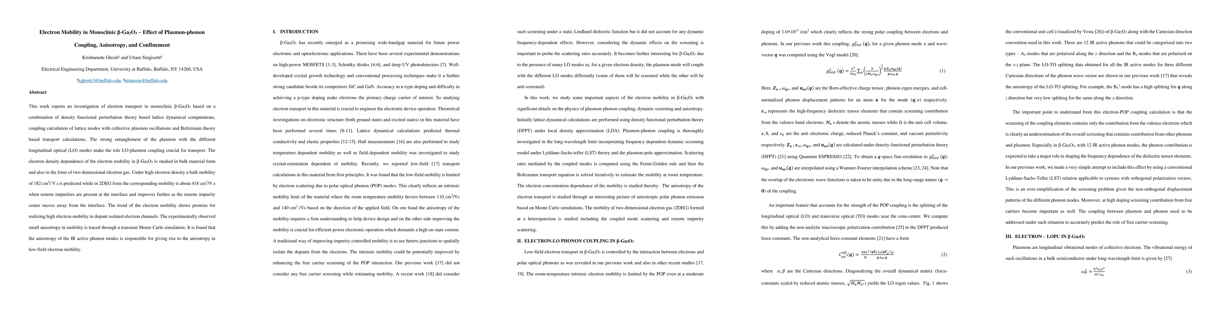 This study investigates electron transport in monoclinic β-Ga₂O₃, revealing that LO-plasmon coupling significantly influences mobility. High electron density in 2DEG form shows enhanced mobility, up to 418 cm²/V.s, with anisotropy traced to IR active phonon modes.