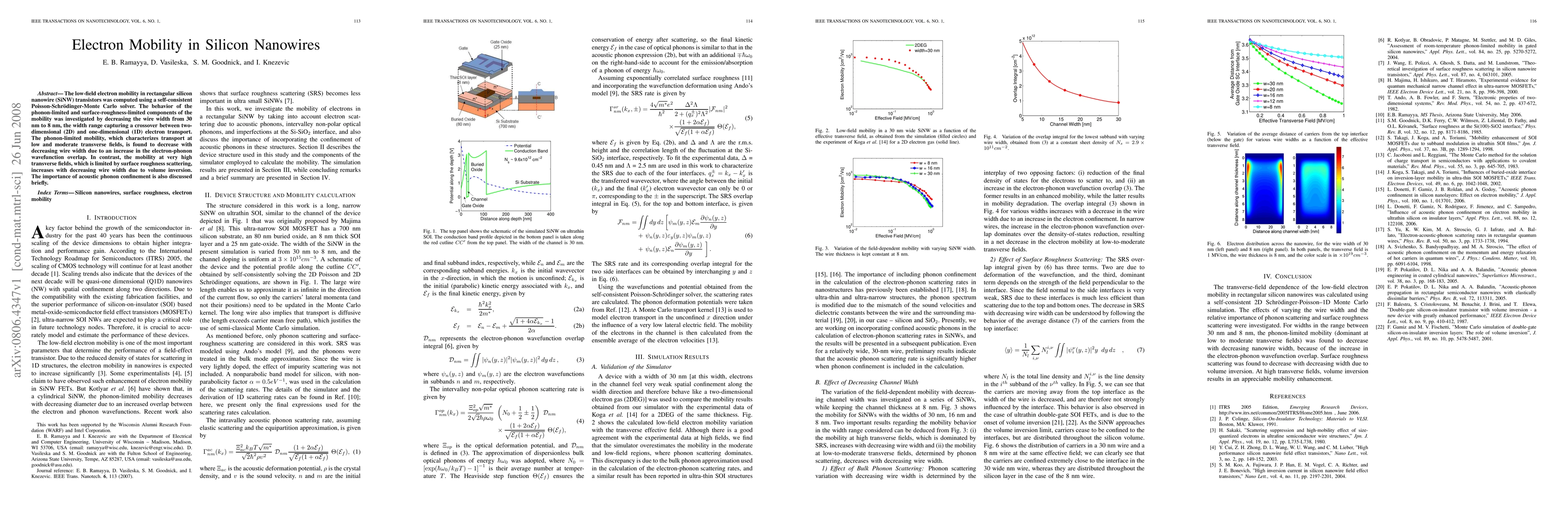 This study investigates electron mobility in silicon nanowire transistors, finding that phonon-limited mobility decreases with narrower wire widths due to increased electron-phonon overlap, while surface-roughness-limited mobility increases due to volume inversion effects. Acoustic phonon confinement's role is also briefly discussed.