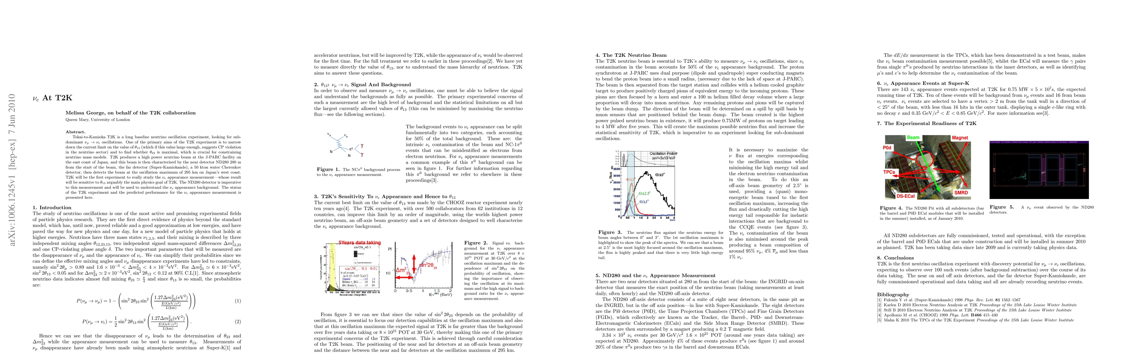 The T2K experiment aims to detect electron neutrino oscillations from muon neutrinos, focusing on determining the value of theta13 and the maximality of theta23 for neutrino mass model constraints. The experiment uses a high-power neutrino beam from J-PARC, characterized by ND280 and detected by Super-Kamiokande, to study electron neutrino appearance.